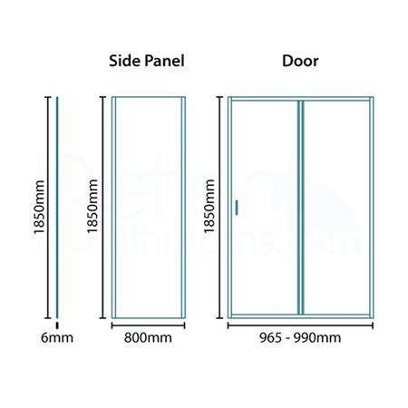A 6mm thick glass sliding shower enclosure adjustable between 950mm and 990mm for the door and 1850mm in height.