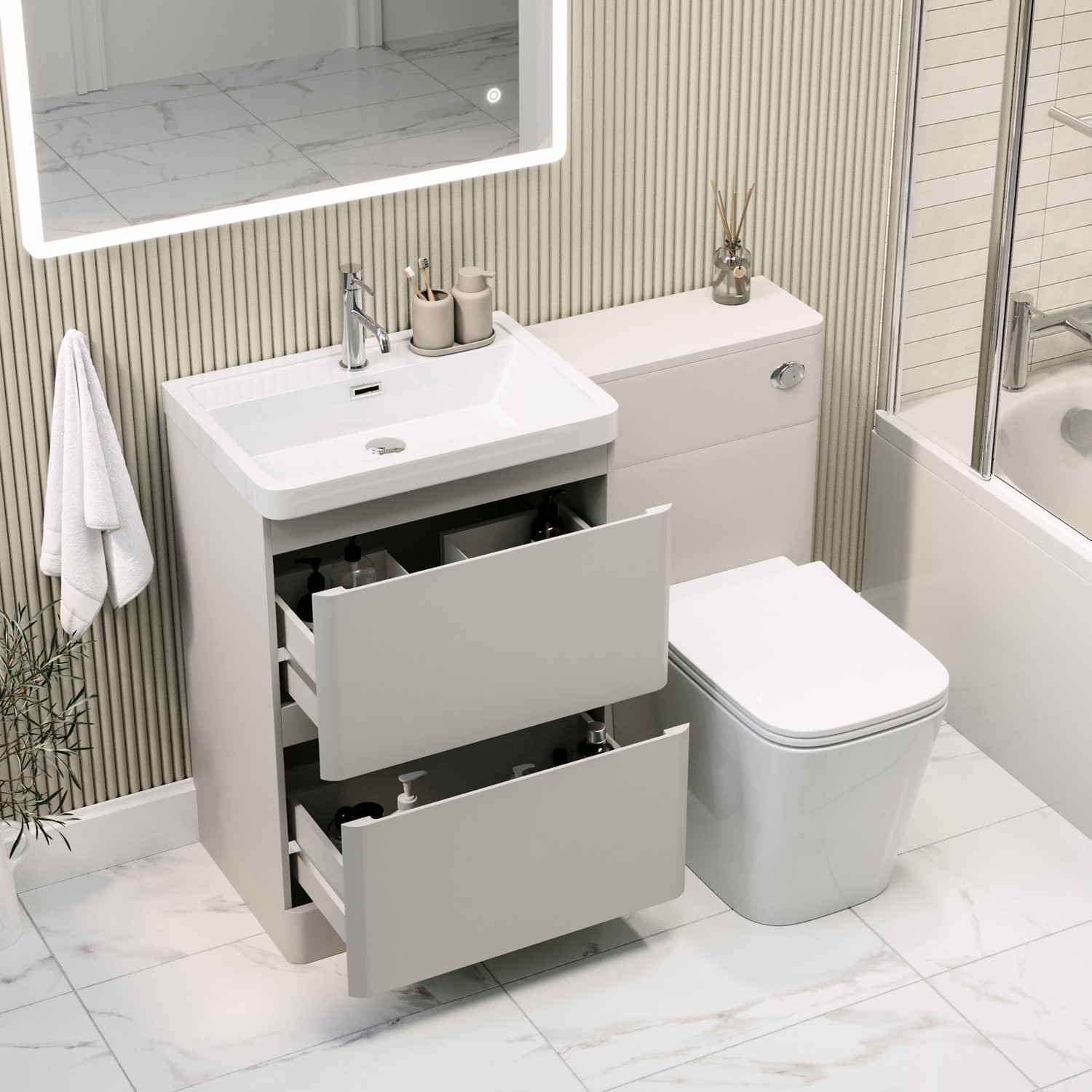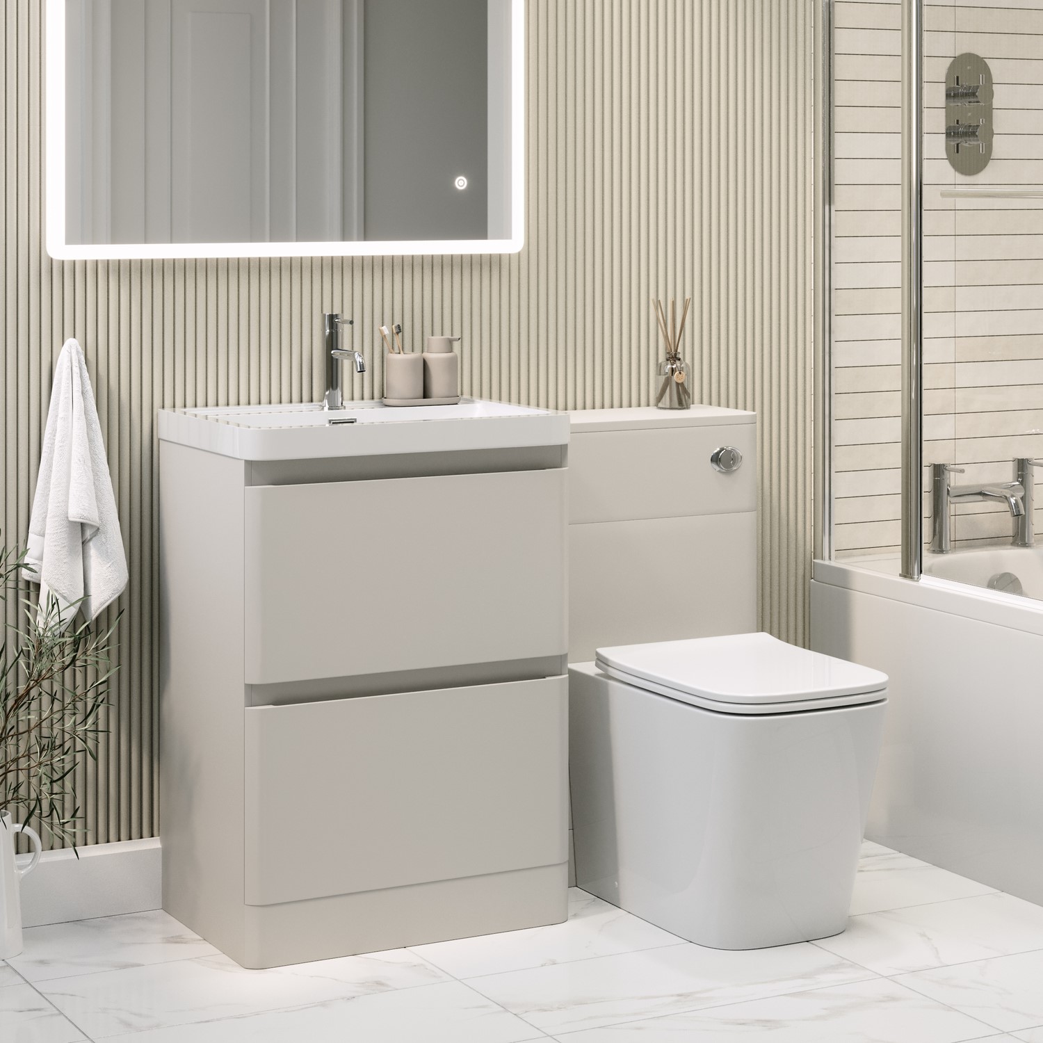 Upgrade your bathroom with the modern elegance of the Pendle reversible toilet and sink unit. This all-in-one solution combines smart functionality with striking aesthetics, featuring a seamless handleless design in a sophisticated matt beige finish. Clean lines and smooth curves create a minimalist look that complements any contemporary space. The unit includes two generous soft-close drawers, perfect for keeping your daily essentials neat and within easy reach. Designed for flexibility, the reversible layout lets you position the basin vanity unit on either side of the toilet unit, allowing for a tailored fit to your room’s configuration. The premium resin basin adds a crisp, clean focal point that’s both durable and easy to maintain. Add a basin mixer tap in a finish of your choice to complete the look. Please note, the basin is equipped with a pre-fitted chrome overflow cover. This pre-assembled set ensures a quick and stress-free installation. The toilet unit is designed to match the Pendle matt beige range, ensuring a cohesive look throughout your bathroom. It comes complete with a coordinating ceramic back-to-wall toilet in a sleek square shape and glossy white finish. The rimless bowl enhances hygiene and makes cleaning easier, while the soft-close seat with a quick-release function adds convenience and comfort. A concealed cistern with a dual flush system offers efficient water use, and the chrome push button flush plate provides a refined finishing touch that elevates the overall design. Whether you're renovating or refreshing, the Pendle unit delivers a smart, space-saving solution without compromising on style. While the unit is water-resistant, it isn't waterproof so we recommend wiping away any splashes or spills to help keep it looking its best and performing well over time.