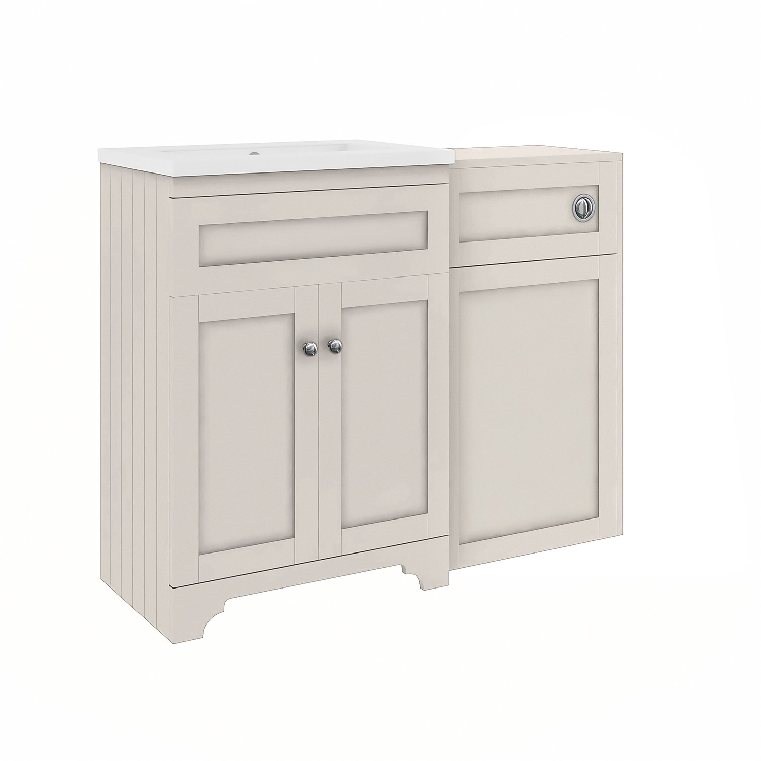 Enhance your bathroom with this charming Baxenden 1100mm toilet and sink unit, finished in a classic matt beige. The traditional styling features classic tongue-and-groove side panelling, shaker doors and ornate front skirting details to add a feature piece to your bathroom. This toilet and sink unit provides ample storage with a shelved cupboard behind the soft close doors, and is reversible meaning you can chose which side the toilet unit and pan sit to suit your bathroom layout. The vanity unit and toilet unit can also be separated if you wish and positioned apart from one another.