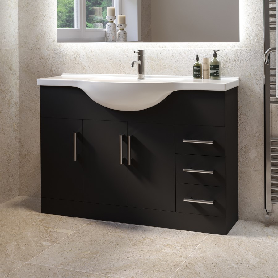 Elevate your bathroom with this large modern floorstanding 1200mm Classic matt black basin vanity unit, designed to offer both style and everyday practicality. With its clean, minimalist lines and smooth matt black finish, this design brings a bold yet understated presence to contemporary bathrooms. The semi recessed basin provides a luxurious curved design that sits comfortably within the unit while offering deep wash space and ample countertop space with the large 1200mm width. The ceramic basin features a luxurious, crisp gloss-white finish that not only brightens your space but is designed for everyday practicality making cleaning quick and easy. It includes one central pre-drilled tap hole, making it suitable for a mono basin mixer tap of your choice, and features a round chrome overflow cover to complete the look.