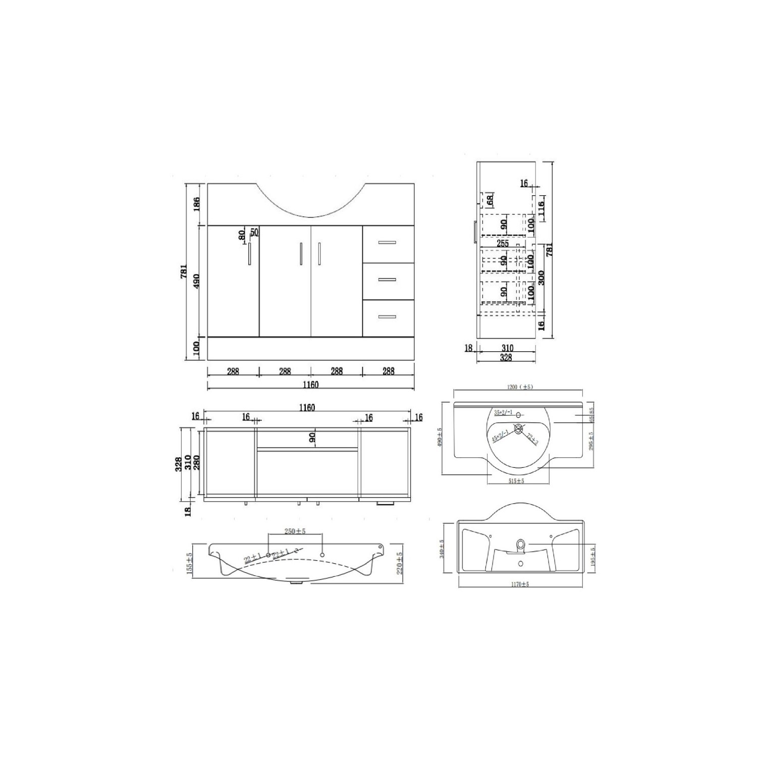 - Overall Basin Vanity Dimensions (including basin): H840 x W1205 x D 495 mm (the vanity footprint is 1160mm, however the basin overhang brings the total width to 1205mm and depth to 495mm)