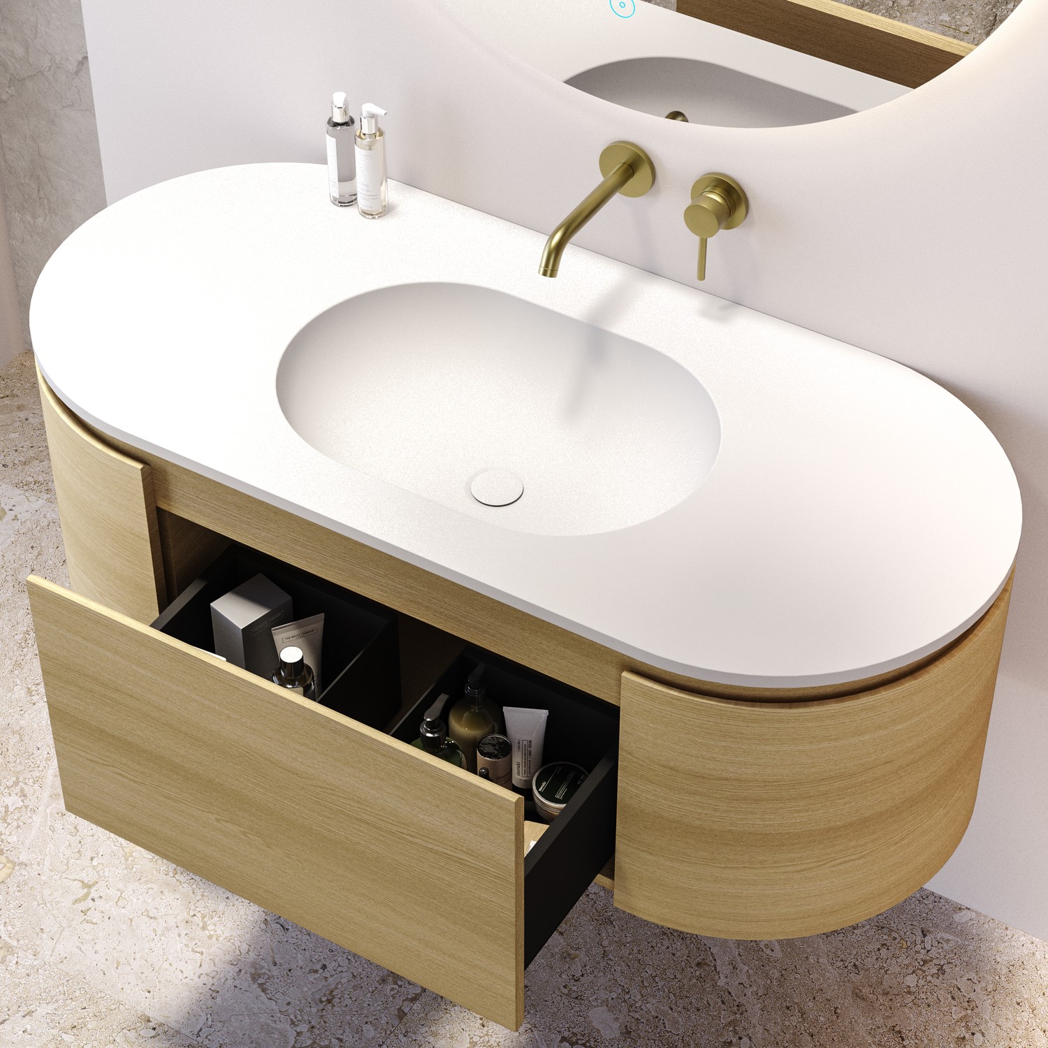 A refined expression of modern luxury, the Cali 1200mm wall hung vanity unit is designed to anchor the bathroom with sculptural presence and quiet sophistication. Its elongated, softly curved form is wrapped in a natural oak effect finish, delivering a clean, contemporary profile. Every detail is intentional—included the concealed storage drawer that preserves the vanity’s architectural purity - opening with the concealed chamfered edged handle and closing with a soft close mechanism to ensure an extra touch of luxury. The floating installation enhances the vanities statement quality, whilst also opening up floor space to create the feeling of a more open and larger bathroom.