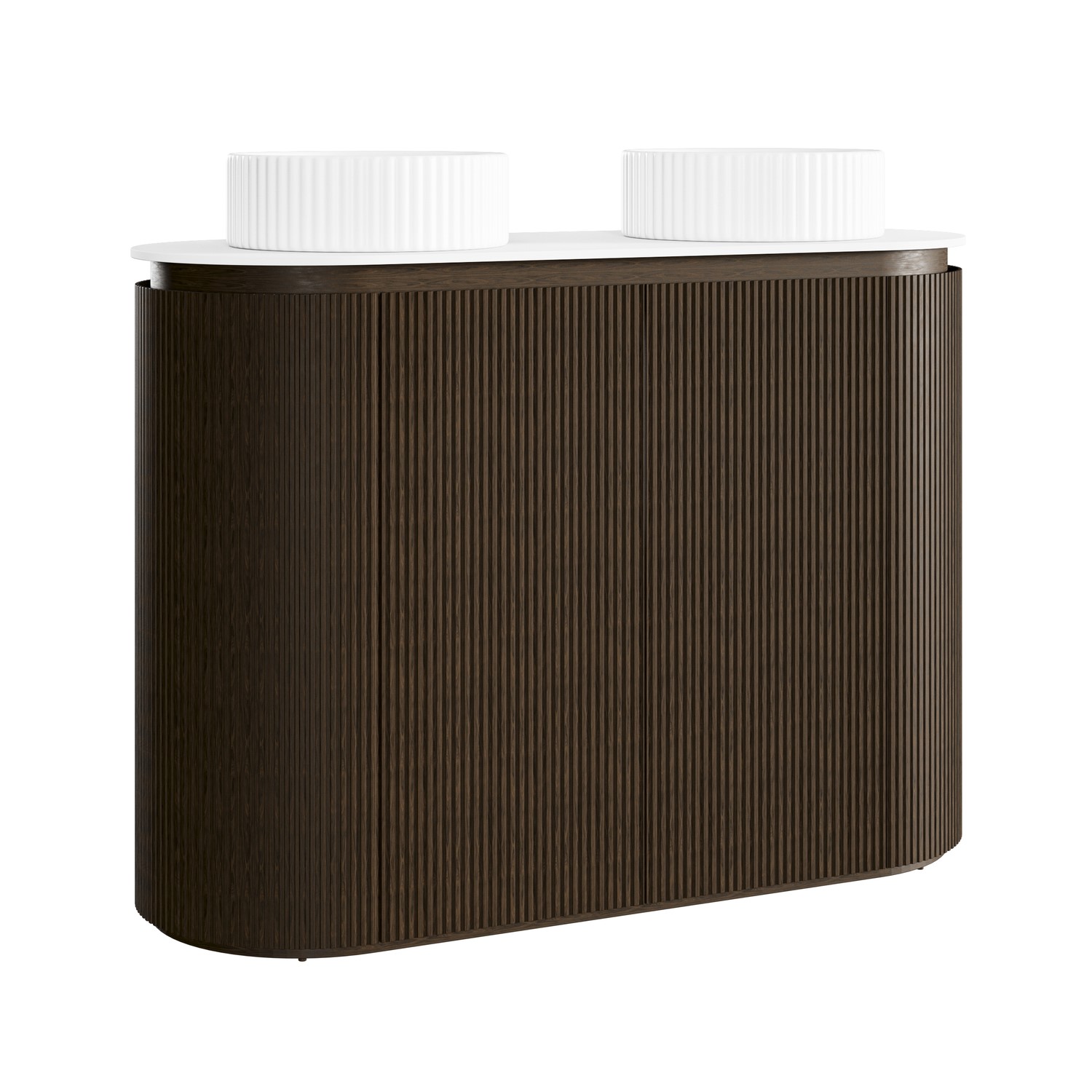 Curved Fluted Double Vanity Design: Freestanding double basin vanity unit with a modern curved walnut wood effect veneer fluted finish, adding texture and softness to any contemporary bathroom.