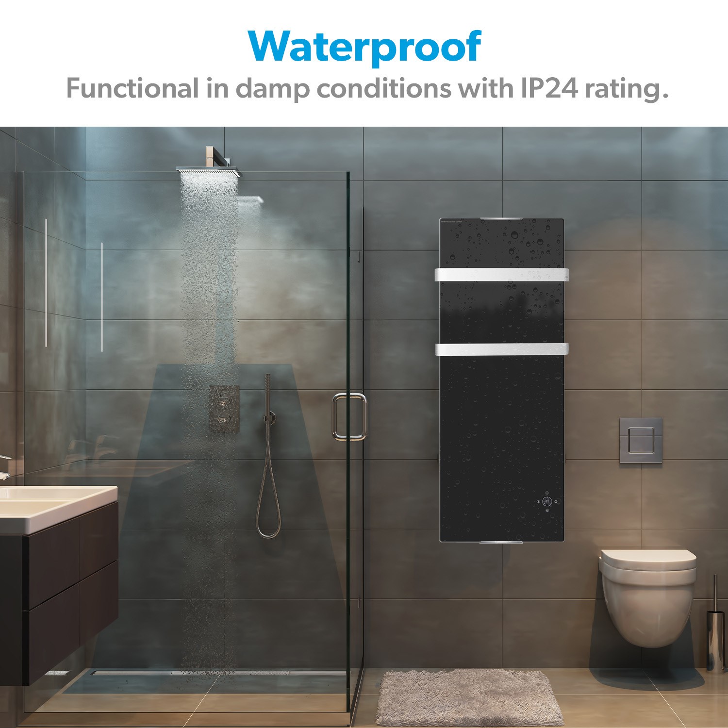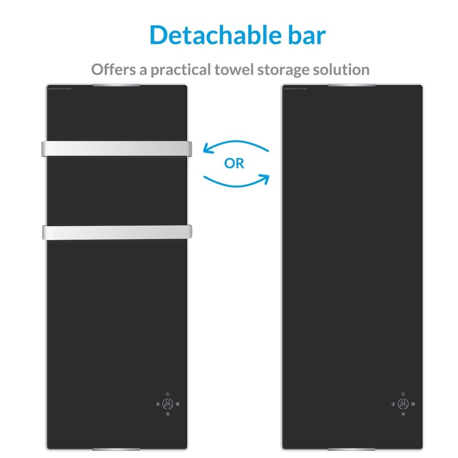 This designer glass radiator is a sleek, stylish and space-saving alternative to traditional forms of heaters. Cleverly designed, the vertical heater also has 2 removable towel rails making it great for narrow spaces and bathrooms but its tempered glass design stands out in any room.