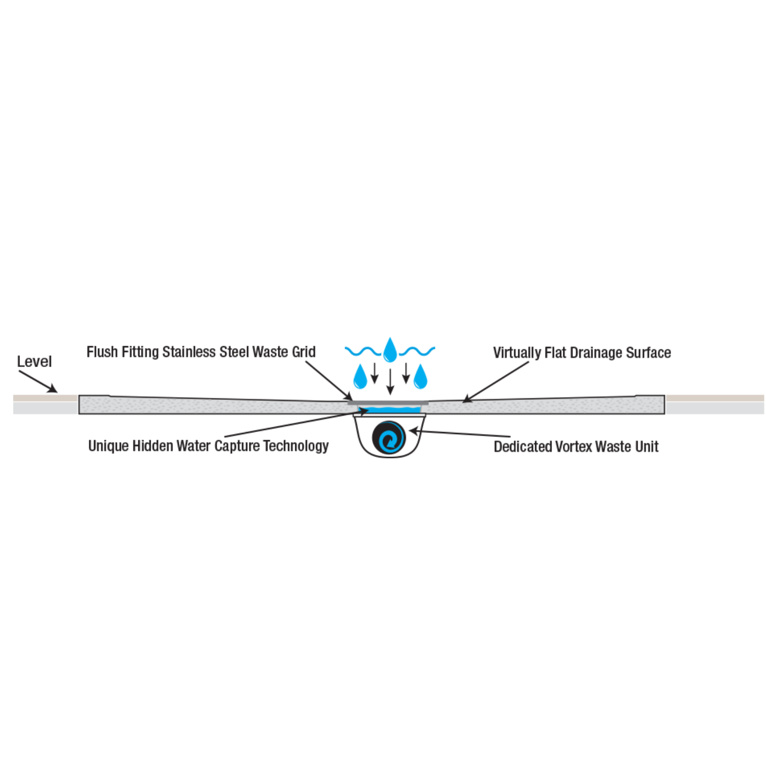Flush-Fitted Waste: Includes a stainless steel square waste cover and high-capacity waste, tested to drain up to 30L per minute.