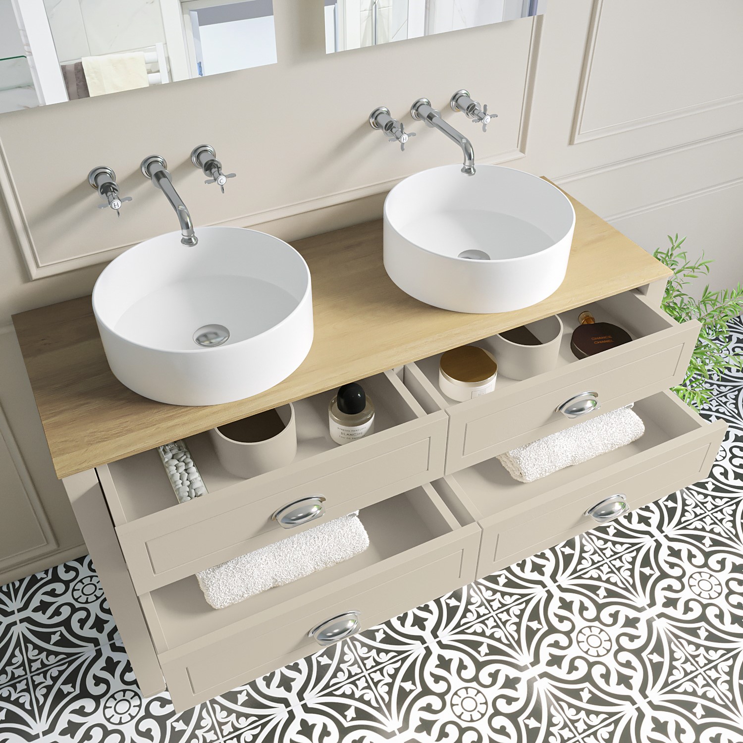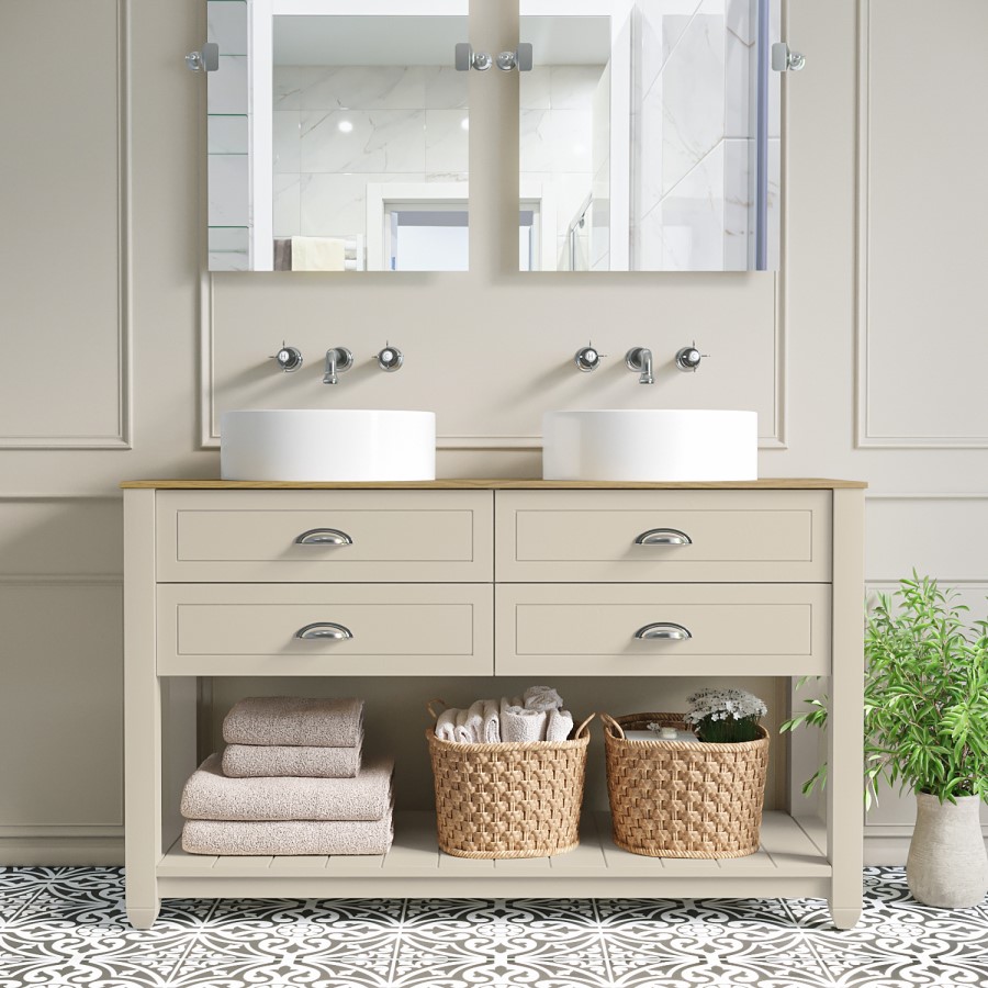 This timeless design will update your bathroom and be the perfect centrepiece with its matt beige finish that harmonises beautifully with its wooden top, and chrome cup pull handles. It has a traditional meets modern styling that will look great in any bathroom and the neutral beige sits well in any colour scheme.