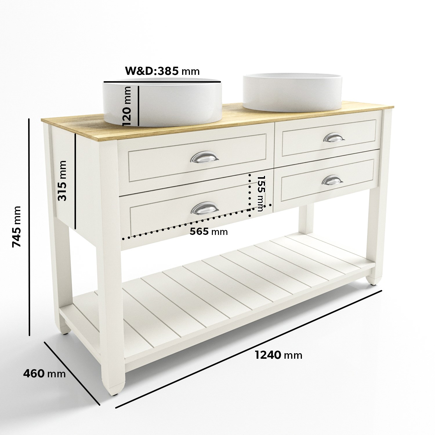 - Four wide drawers with soft closing hinges & stylish chrome cup pull handles