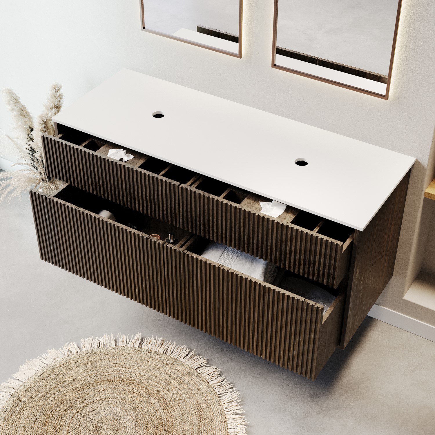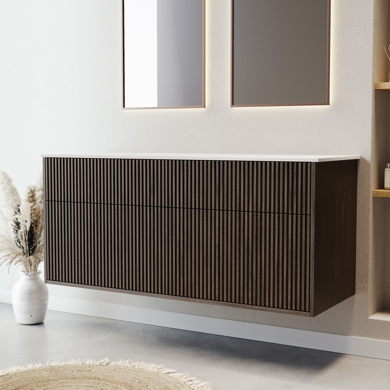 Upgrade your bathroom with our dark wood effect fluted Matira 1250mm wall hung double vanity unit bringing a contemporary luxe style to your home. The floating vanity unit offers a space saving solution, opening up your floor space, whilst providing ample storage. The four deep fluted drawers with push to open and soft closing mechanisms add a premium touch to your bathroom.