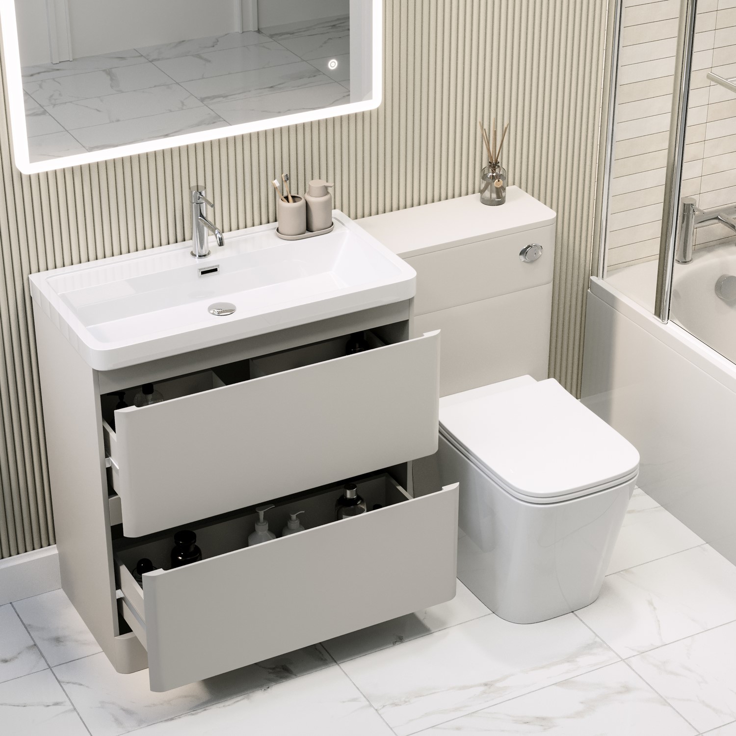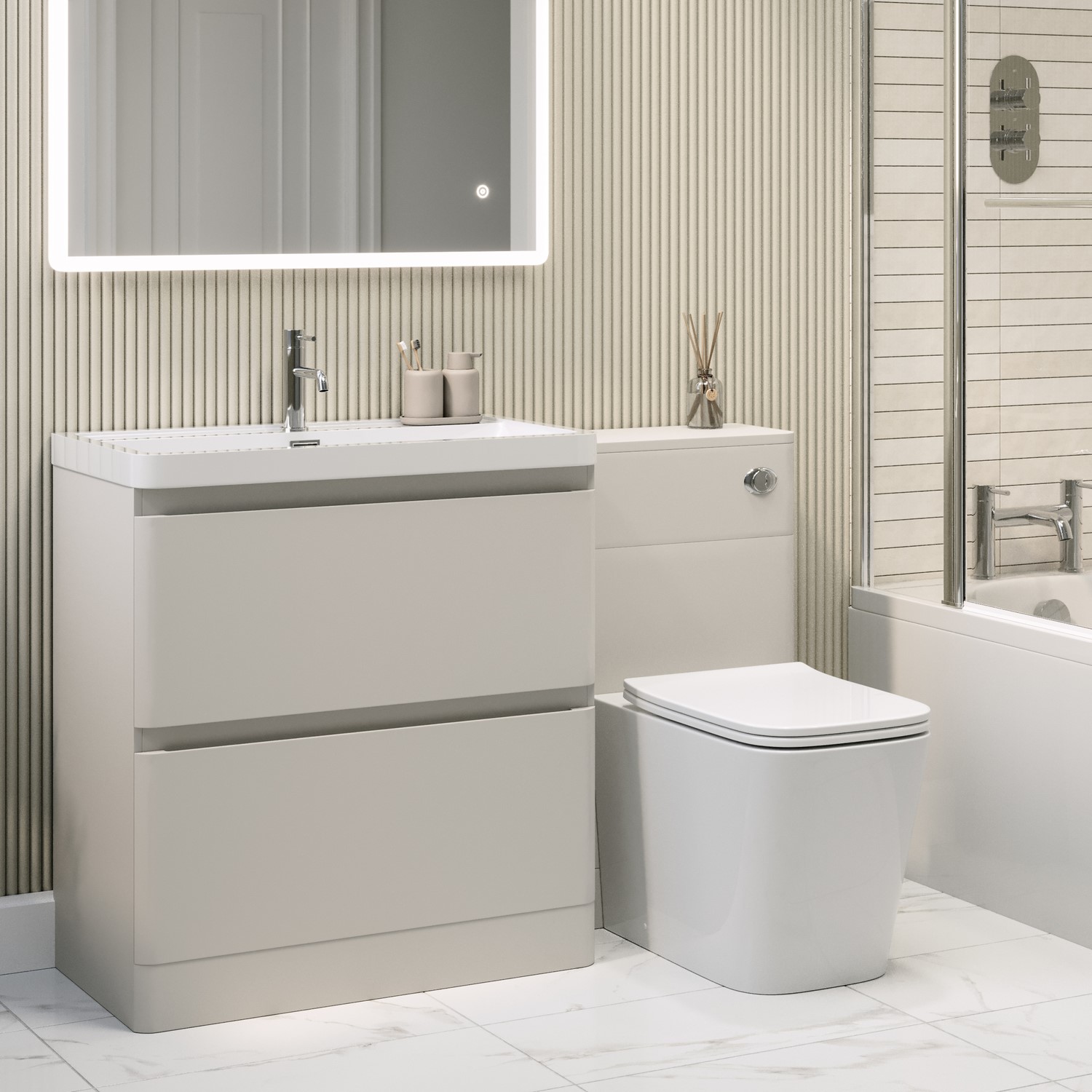 Upgrade your bathroom with the modern elegance of the Pendle reversible toilet and sink unit. This all-in-one solution combines smart functionality with striking aesthetics, featuring a seamless handleless design in a sophisticated mat beige finish. Clean lines and smooth curves create a minimalist look that complements any contemporary space. The unit includes two generous soft-close drawers, perfect for keeping your daily essentials neat and within easy reach. Designed for flexibility, the reversible layout lets you position the basin vanity unit on either side of the toilet unit, allowing for a tailored fit to your room’s configuration. The premium resin basin adds a crisp, clean focal point that’s both durable and easy to maintain. Add a basin mixer tap in a finish of your choice to complete the look. Please note, the basin is equipped with a pre-fitted chrome overflow cover. This pre-assembled set ensures a quick and stress-free installation. The toilet unit is designed to match the Pendle matt beige range, ensuring a cohesive look throughout your bathroom. It comes complete with a coordinating ceramic back-to-wall toilet in a sleek square shape and glossy white finish. The rimless bowl enhances hygiene and makes cleaning easier, while the soft-close seat with a quick-release function adds convenience and comfort. A concealed cistern with a dual flush system offers efficient water use, and the chrome push button flush plate provides a refined finishing touch that elevates the overall design. Whether you're renovating or refreshing, the Pendle unit delivers a smart, space-saving solution without compromising on style. While the unit is water-resistant, it isn't waterproof so we recommend wiping away any splashes or spills to help keep it looking its best and performing well over time.