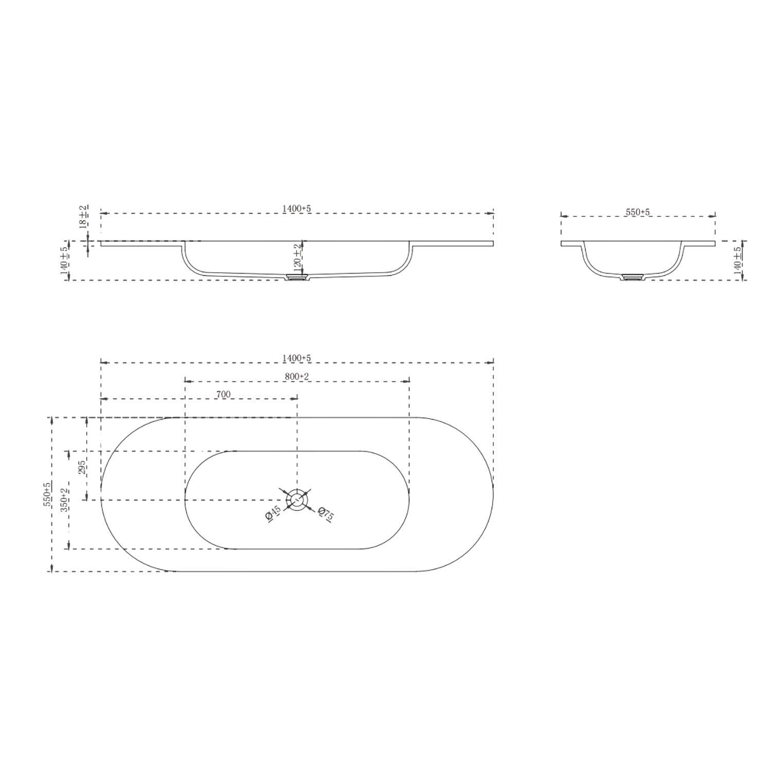 - Overall Basin Vanity Dimensions (including basin): H418mm x W1400mm x D550mm