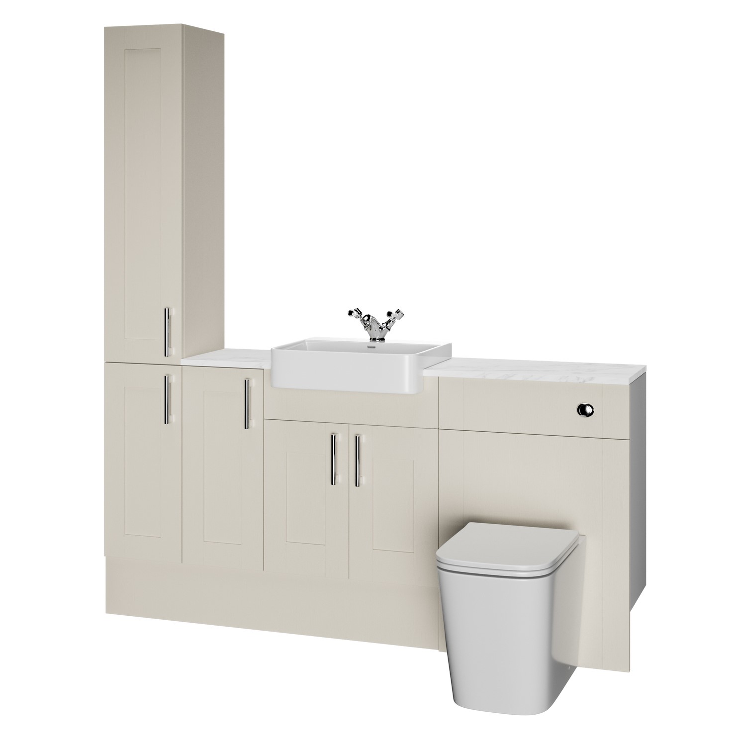 This Vancouver toilet and sink unit brings traditional charm to fitted bathroom furniture. The 1800mm width comprises a 600mm vanity unit, a 600mm toilet unit, a 300mm short storage unit as well as a 300mm tall storage unit - all finished in a warm beige tone with a matt wood grain effect. Shaker-style soft close doors with elegant detailing give this piece its classic character, whilst offering ample storage to keep your bathroom essentials neatly organised within the vanity unit, short storage unit and tall storage unit.