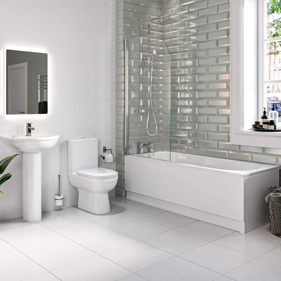 1800mm Straight Bath with Chrome Waste, Bath Screen and Acrylic Front & End Panel, Close Coupled Toilet with Cistern & Soft Close Seat and Pedestal Basin with Waste