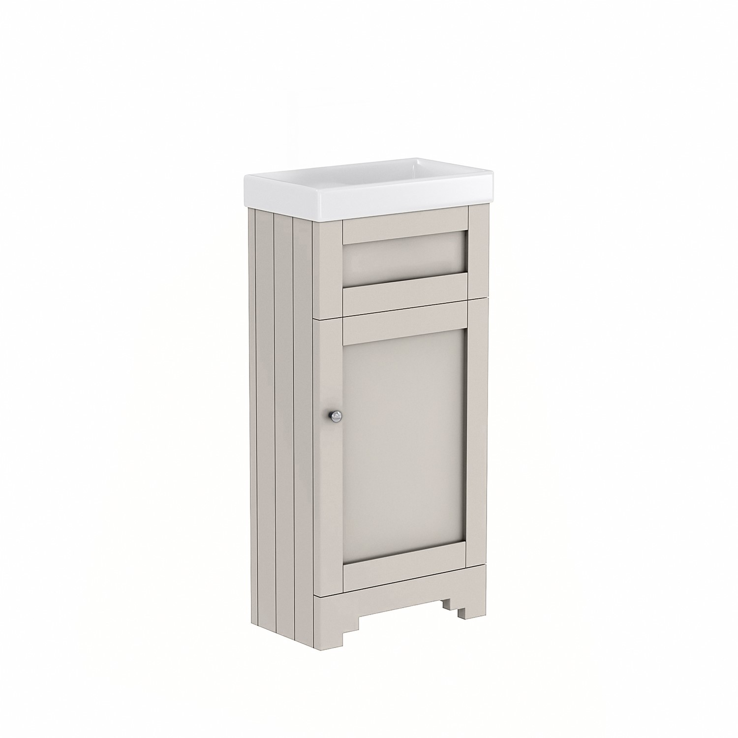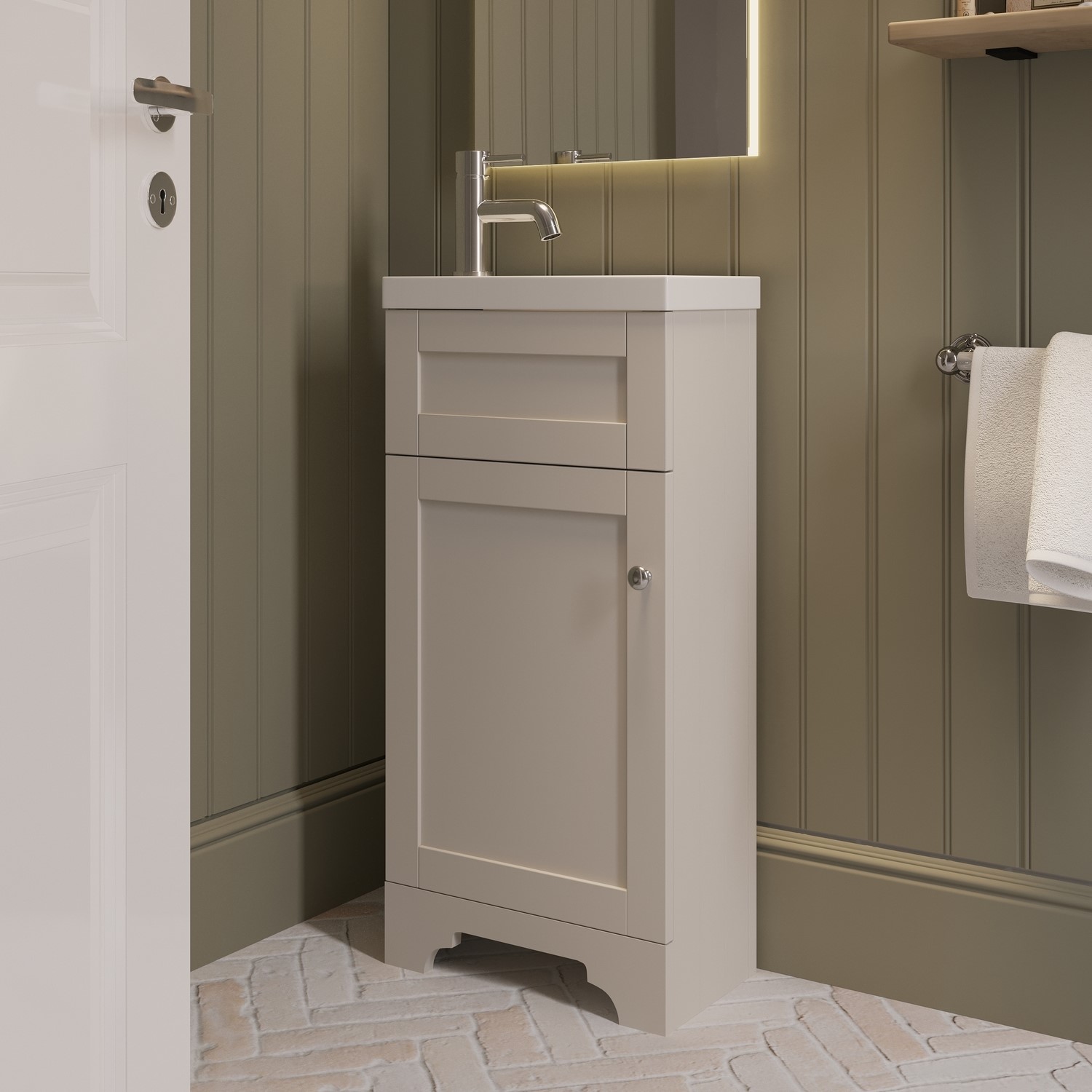 Transform your bathroom with this charming Baxenden freestanding 400mm vanity unit, finished in a classic matt beige. The traditional styling features classic tongue-and-groove side panelling, shaker doors and ornate front skirting details to add a feature piece to your bathroom. This vanity unit makes brilliant use of smaller spaces with its 226mm depth whilst providing essential storage, making it perfect for ensuites or cloakrooms. Not only is the door opening configurable to suit either a left hand or right hand opening, the basin can also be fitted to suit your tap placement preference - either on the left or right hand side.