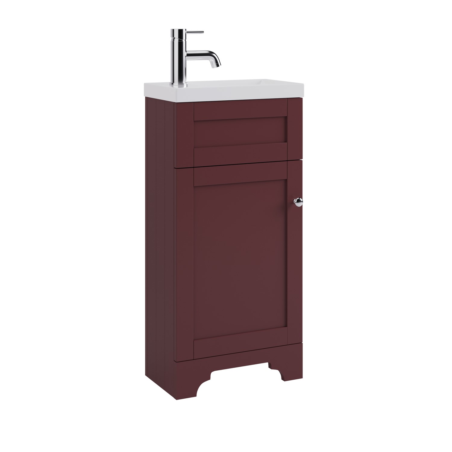 Transform your bathroom with this charming Baxenden floorstanding 400mm vanity unit, finished in a classic matt burgundy red. The traditional styling features classic tongue-and-groove side panelling, shaker door and ornate front skirting details to add a feature piece to your bathroom. This slim vanity unit makes brilliant use of smaller spaces, with a compact 226mm depth that still provides essential storage — ideal for ensuites or cloakrooms. Not only is the door and handle opening configurable to suit either a left hand or right hand opening, the basin can also be fitted to suit your tap placement preference - either on the left or right hand side. This vanity comes with a ceramic inset basin, finished in a high quality white gloss to make cleaning a breeze and ensure durability. A predrilled tap hole is included, so you are free to add a cloakroom mono basin mixer tap of your choice to match the included chrome handle. Check out our recommended accessories if you would like to upgrade your handle to another finish.