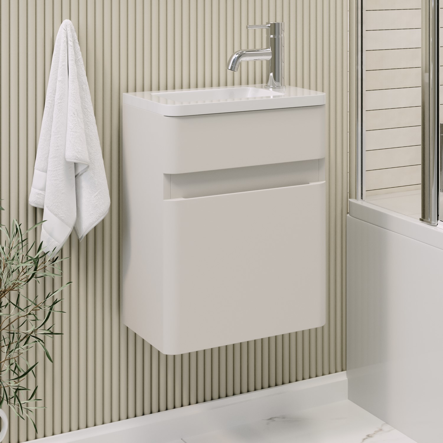 Maximise your bathroom’s floor space with this sleek, beige 410mm wall-hung vanity unit from the Pendle range. Its floating design creates a modern, minimalist look whilst adding extra floorspace and making floor cleaning effortless. This compact vanity unit is ideal for smaller bathrooms, offering a stylish solution without compromising on functionality. Designed for convenience, it features a reversible soft-close door with an integrated handle, giving you flexible installation options and smooth, quiet operation. The unit’s elegant curves enhance any contemporary space and pair perfectly with the Pendle toilet unit. This vanity unit includes a fitted resin basin with a white gloss finish for a fresh, stylish touch that reflects light beautifully. The basin features a pre-drilled tap hole located on the right-hand side, allowing for easy tap installation. Please note: the basin is not reversible. A chrome-finished overflow adds a polished detail while helping to prevent overfilling. Choose a cloakroom basin mixer tap of your choice of finish to complete the look. Delivered preassembled for quick installation—just secure the basin, fit your tap, and enjoy a smart, space-saving upgrade for your bathroom. While the unit is water-resistant, it isn't waterproof so we recommend wiping away any splashes or spills to help keep it looking its best and performing well over time.