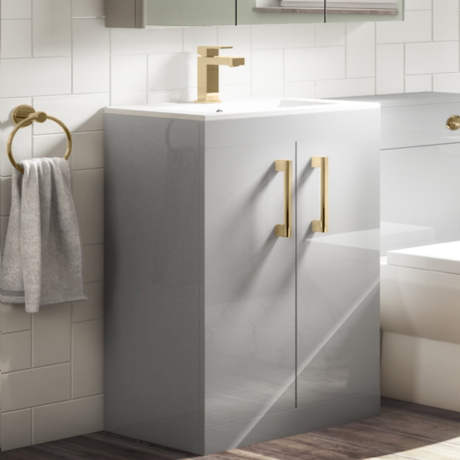 - Gorgeous grey gloss finish and the stylish brass integrated handle is contrasting