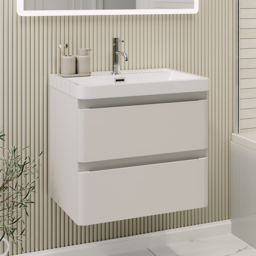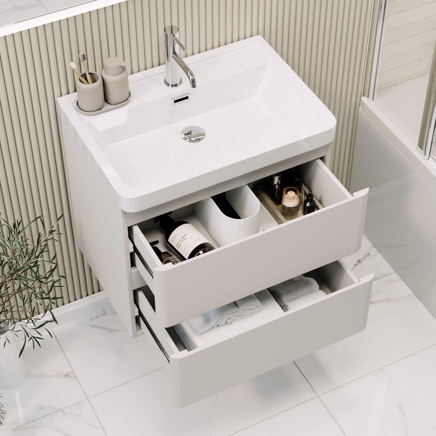 Maximise your bathroom’s floor space with this sleek, beige wall-hung 600mm vanity unit from the Pendle range. Its floating, wall-hung design creates a modern, minimalist look whilst adding extra floorspace and making floor cleaning effortless. This wall hung vanity unit is designed for convenience, featuring two spacious soft-close drawers with integrated handles, providing ample storage for your bathroom essentials. The unit’s elegant curves complement any contemporary family bathroom and pair perfectly with the Pendle toilet unit. This vanity unit includes a fitted resin basin with a gloss white finish for a fresh, stylish touch, which reflects light beautifully. This unit comes preassembled, all you have to do is simply secure the basin. Choose a basin mixer tap of your choice of finish to complete the look. Please note, the basin comes with a pre-fitted chrome overflow cover. While the unit is water-resistant, it isn't waterproof so we recommend wiping away any splashes or spills to help keep it looking its best and performing well over time.