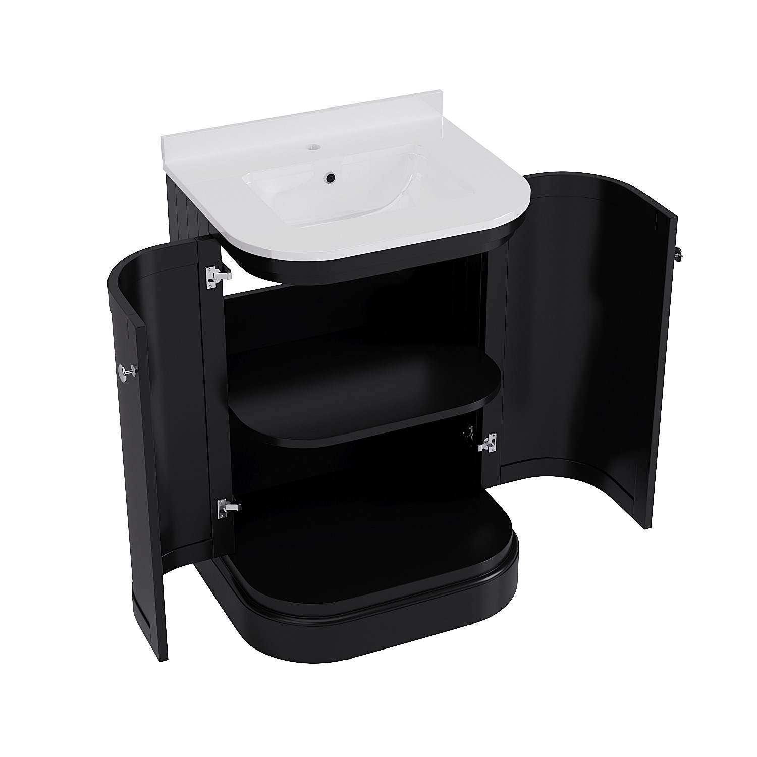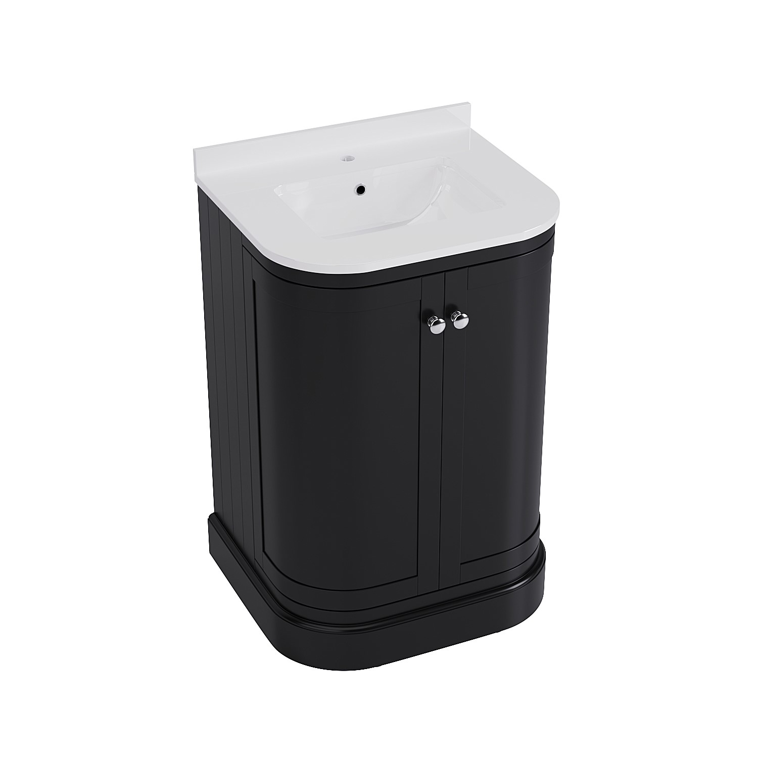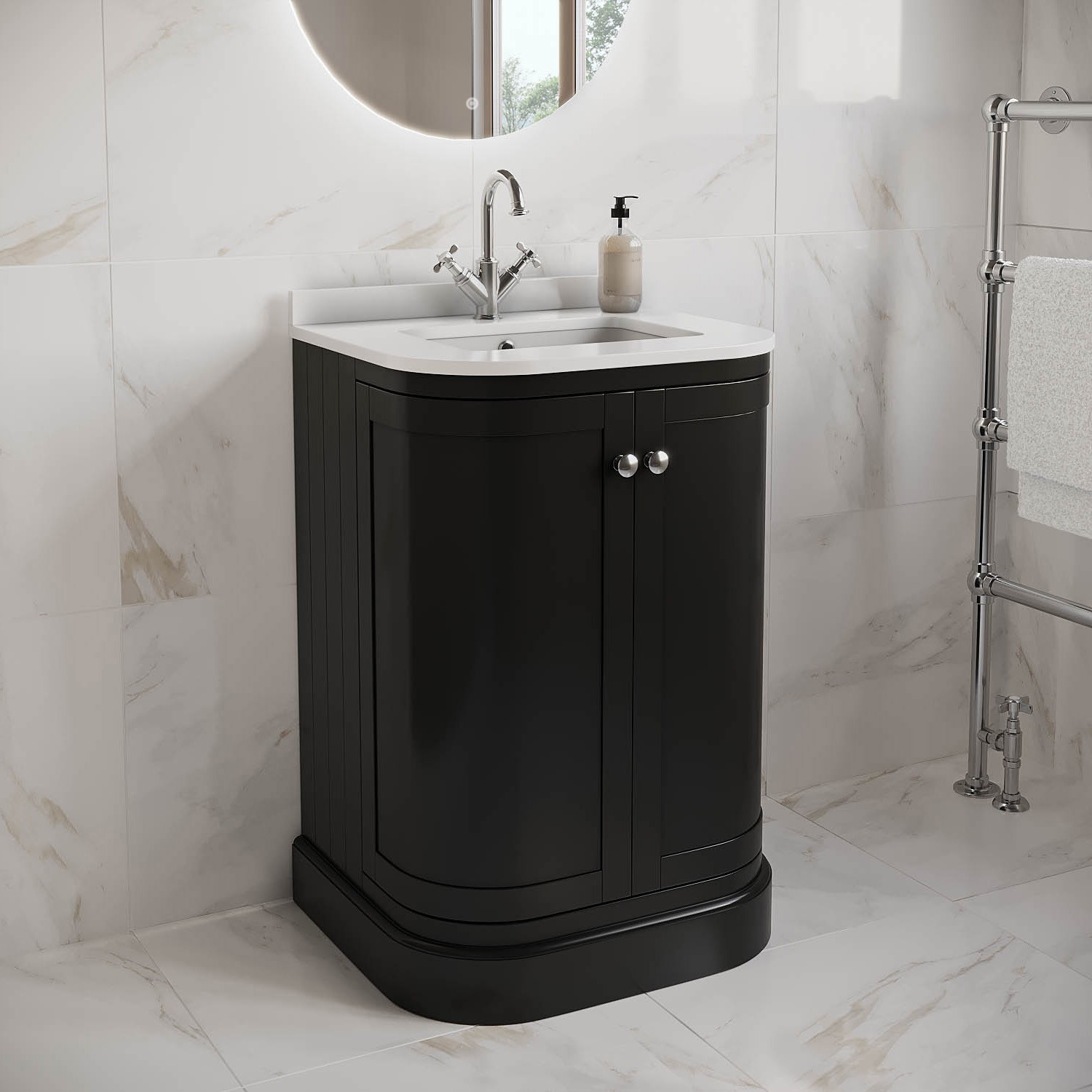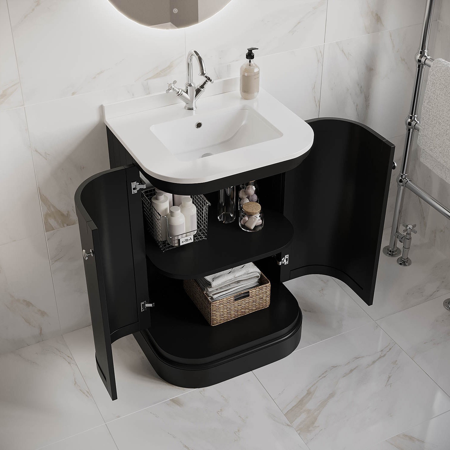 Transform your bathroom into a refined sanctuary with the Bowland 600mm curved Floorstanding vanity unit. Finished in a bold satin black, this vanity is inspired by timeless traditional elegance, this beautifully contoured design combines soft curves with a flawless finish, creating a statement piece that exudes sophistication. The unit features polished chrome handles for a touch of classic luxury, paired with a sleek resin inset basin, complete with matching chrome overflow cover and a premium quartz worktop surround—a combination that delivers durability and style in equal measure. Two soft close curved doors open wide to reveal an internal shelf offering generous under-sink storage, ideal for keeping everyday essentials organised and within easy reach.