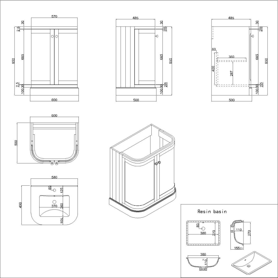- Overall Basin Vanity Dimensions (including basin): H850mm x W600mm x D500mm