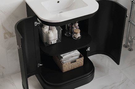 Give your bathroom the update it deserves with our Bowland black basin vanity unit. It features an Art Deco-inspired curved unit with polished chrome handles, a sleek undermount resin inset basin* and a highly durable quartz worktop surround, which complement each other perfectly. The doors open wide for easy access and storage, plus, it makes cleaning inside effortless.