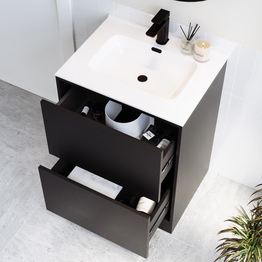 Modernise your bathroom with the Palma black basin vanity unit. Practical and stylish with clean lines, it is the perfect addition to your bathroom. The push to open drawers have a soft closing mechanism to prevent slamming, providing a quieter closure. The drawer opening distance is 255mm so plenty of room for all your bathroom essentials. A high-quality ceramic inset basin is included, which has one central tap hole; a tap isn't included, so you're free to choose one from our wide range. The basin comes with a prefitted chrome overflow but feel free to add on a different overflow cover to match your tap. This vanity unit requires no assembly, secure the basin then install your chosen tap and waste. This unit has a 2 years warranty for added peace of mind.