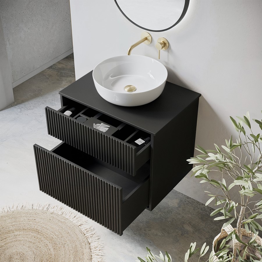 Upgrade your bathroom with our Fluted Matira Vanity Unit bringing a contemporary luxe style to your home. The wall hung vanity unit offers space saving solutions while providing lots of storage space with two deep fluted drawers with push to open and soft closing mechanisms. Paired with a white gloss round basin for a modern finish. The basin is made of high quality ceramic to stand the test of time.