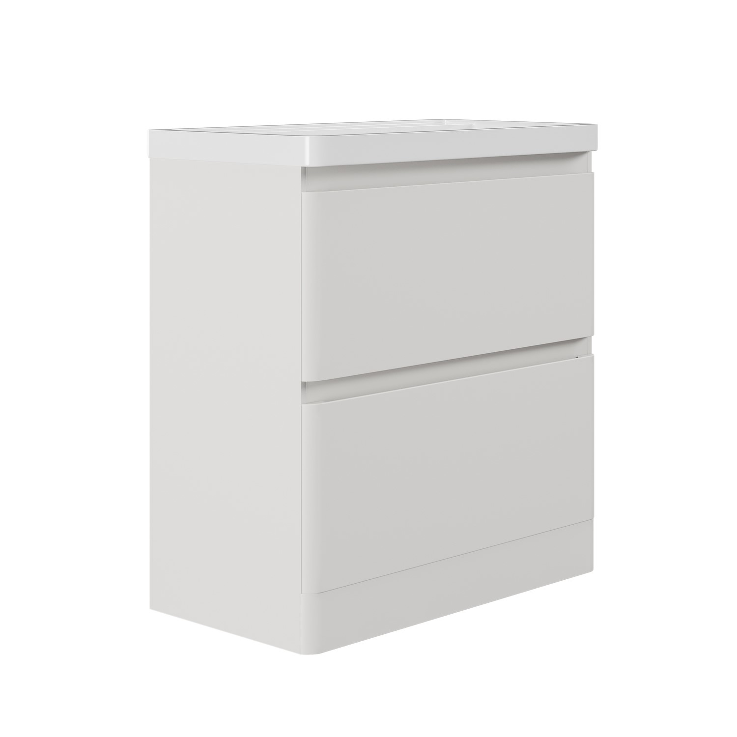 Give your bathroom a fresh, modern look with this sleek, matt beige 800mm floor-standing vanity unit from the Pendle range. Designed for modern living, it offers a contemporary, minimalist look while providing a sturdy, space-saving solution. This freestanding unit features two deep, spacious soft-close drawers with integrated handles, ensuring ample storage for all your bathroom essentials while maintaining a seamless design. The extra height of the floorstanding design allows for deeper drawers, making it ideal for storing bulkier items and maximising vertical space. Its elegant curves complement any modern family bathroom and pair perfectly with the Pendle toilet unit. This vanity unit includes a fitted resin basin with a gloss white finish for a fresh, stylish touch, which reflects light beautifully. This unit comes preassembled—simply secure the basin. Choose a basin mixer tap of your choice of finish to complete the look. Please note, the basin comes with a pre-fitted chrome overflow cover. While the unit is water-resistant, it isn't waterproof so we recommend wiping away any splashes or spills to help keep it looking its best and performing well over time.