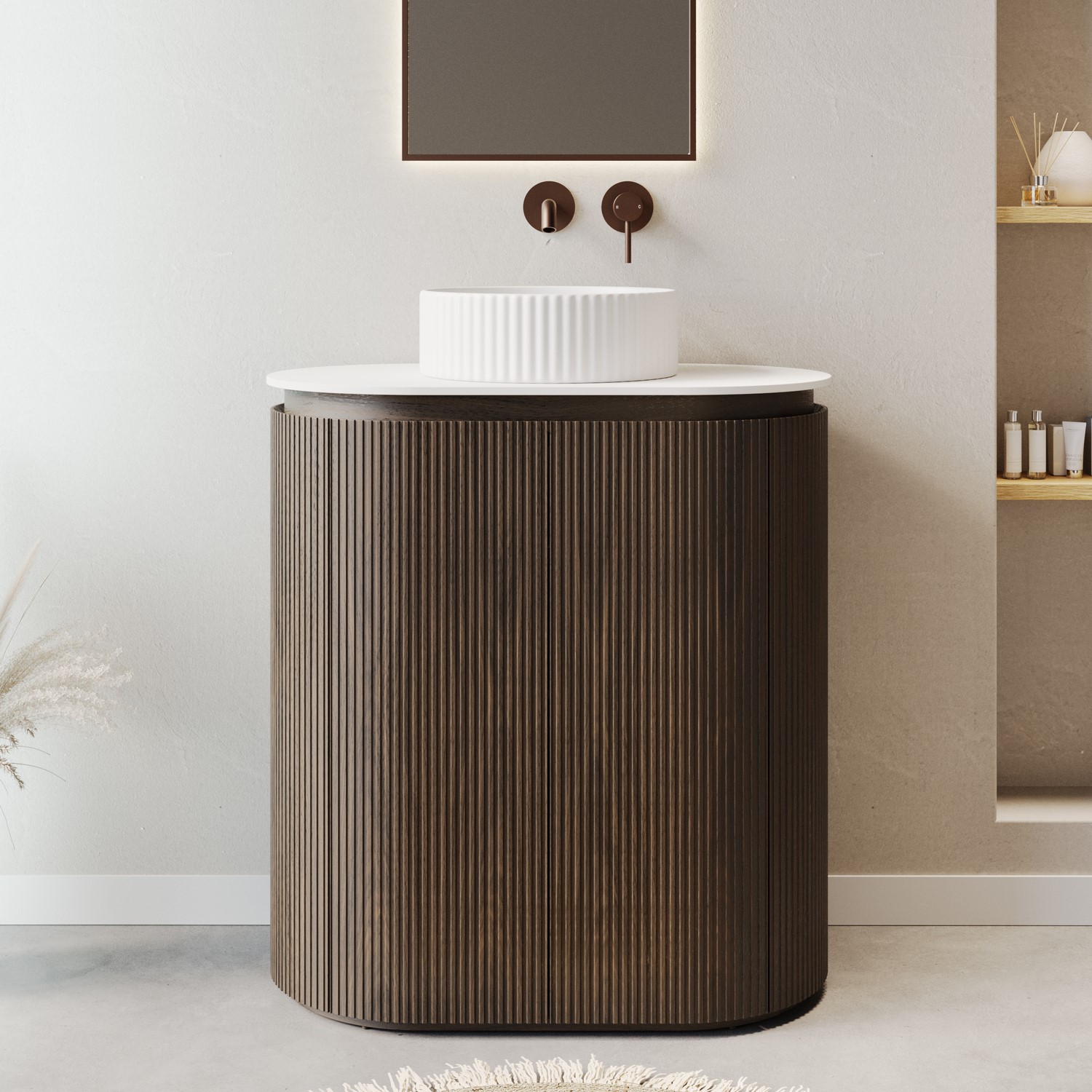Curved Fluted Design: Freestanding basin vanity unit with a modern curved walnut wood veneer fluted finish, adding texture and softness to any contemporary bathroom.