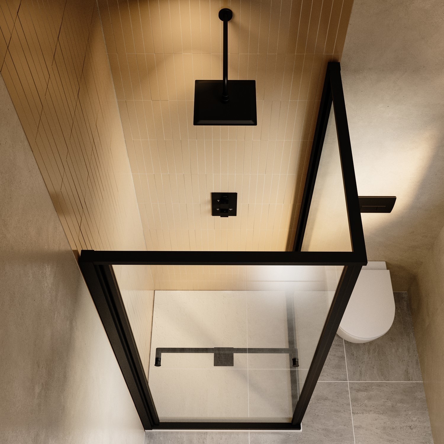 The 900 x 900mm Infold Shower Door with Towel Rail in matt black with shower tray is the perfect solution for compact bathrooms, thanks to its intelligent folding design and space-saving features. The standout feature is its construction — made from robust 6mm toughened safety glass that ensures both user safety and product longevity, and framed in corrosion-resistant, matt black aluminium for a clean and contemporary look.