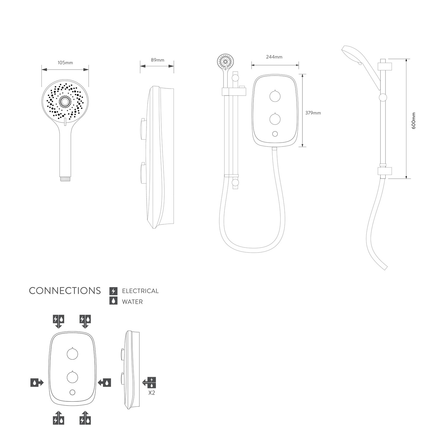 - Box contents: Electric engine, 650mm rail, rail ends, metal hose, hose restraint, 105mm handset, adjustable height slider, fixtures and fittings