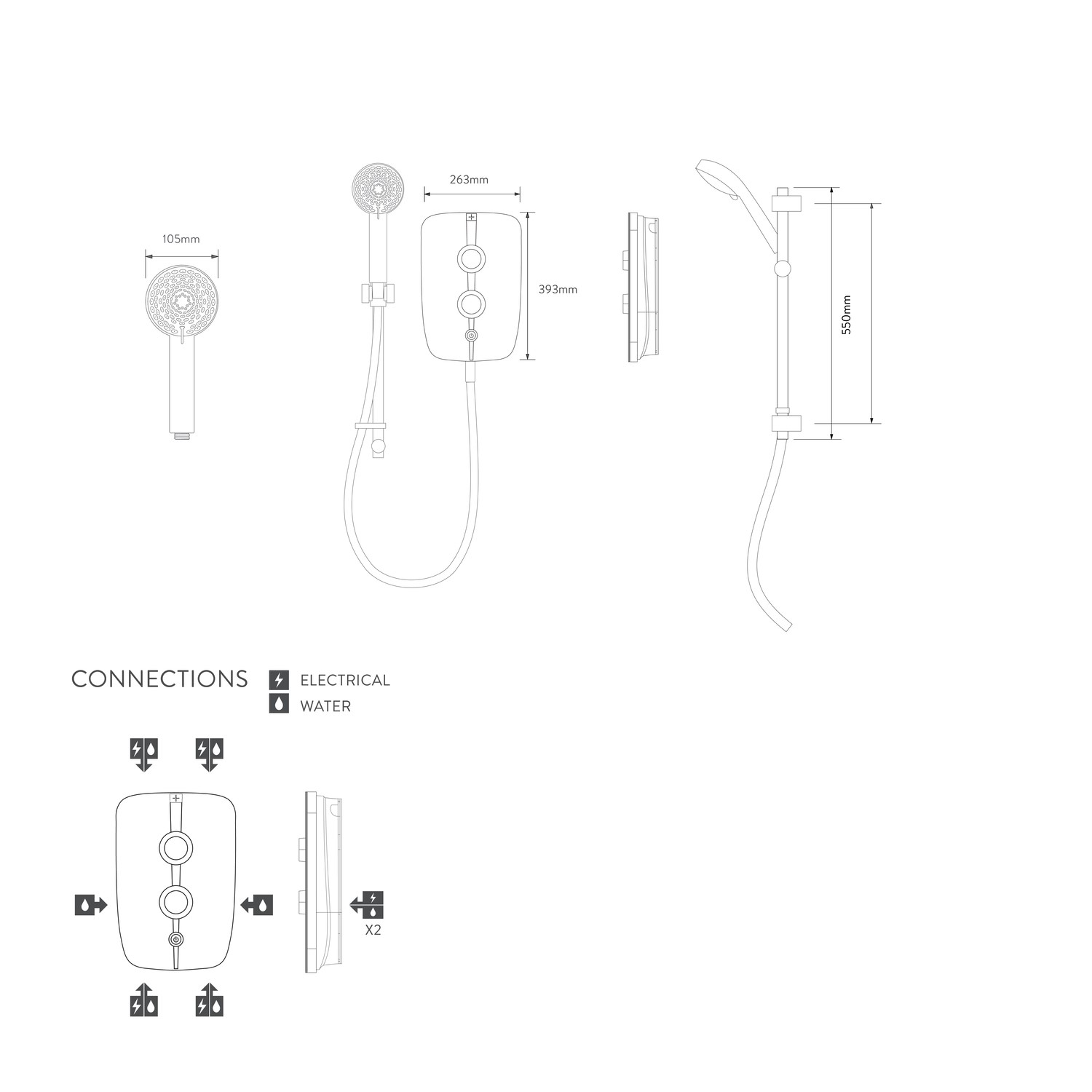 - Box contents: Electric engine, 550mm rail, rail ends, smooth hose, gel hanger, 105mm handset, pinch grip slider, fixtures and fittings