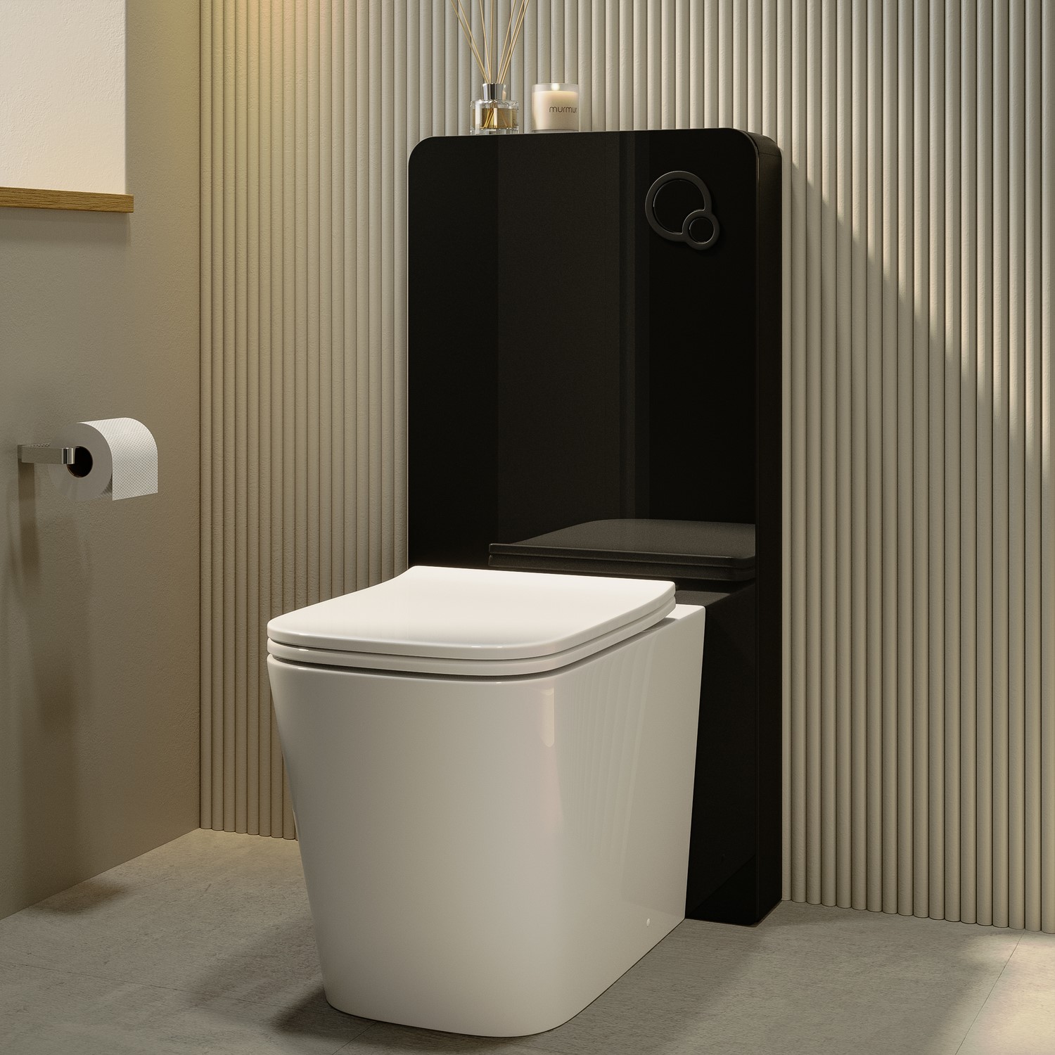 Gloss Black Glass Cistern Cabinet: The sleek Hako cabinet features a toughened glass front and matt steel body, offering a minimalist look while concealing the cistern and pipework.