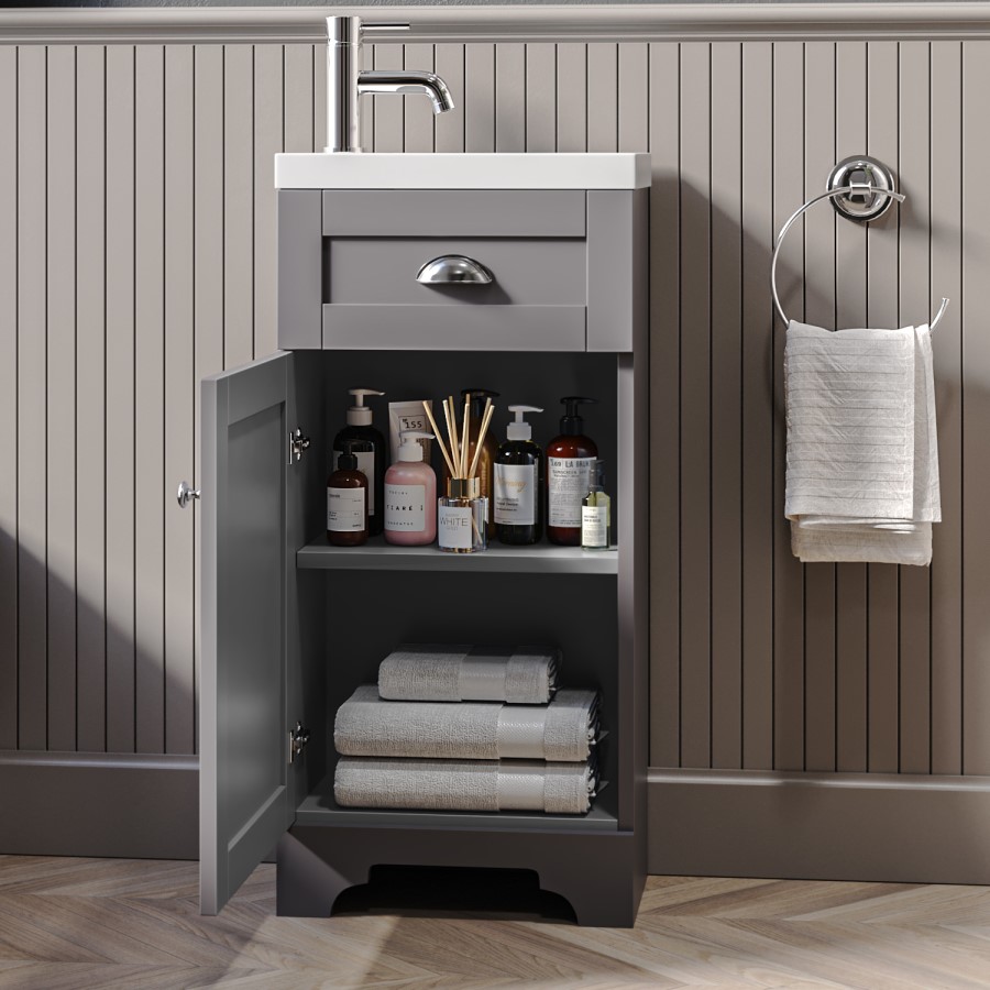 Enhance your bathroom with this Baxenden floor standing vanity basin unit. Characterised by a classic tongue-and-groove side panelling, cup style handles, an ornate front skirting and a matt grey finish, it has that traditional meets modern styling that'll look great in any style of bathroom.