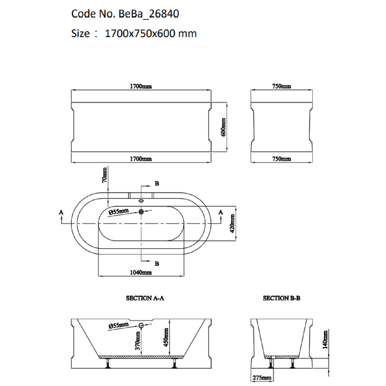 - Dimensions: H600 x W750 x L1700 mm