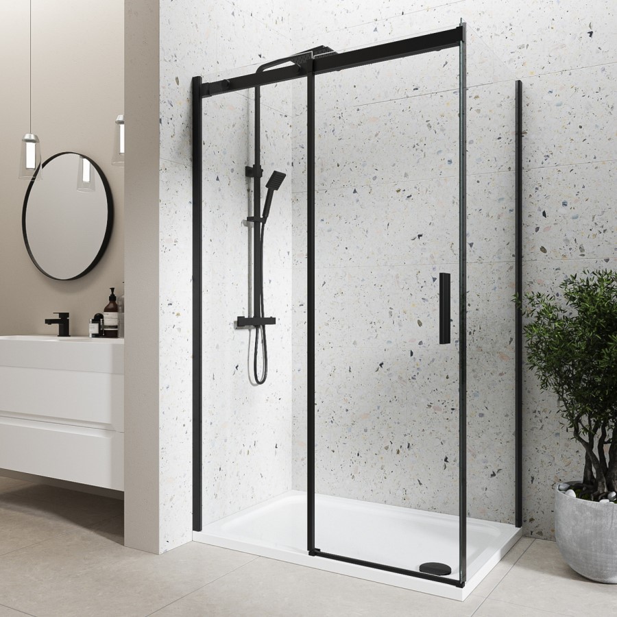 The Aquila frameless rectangular sliding black shower enclosure range is a great addition to your bathroom because it adds simplicity with its matt black frame and practicality with its shape and features. It is available in a variety of sizes, and colours, and with concealed fittings.
