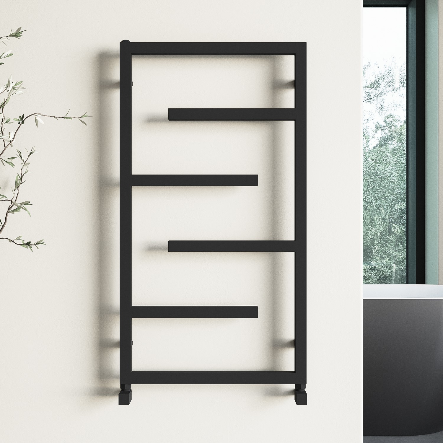 - Sleek matt black towel radiator adds a designer touch to any modern bathroom