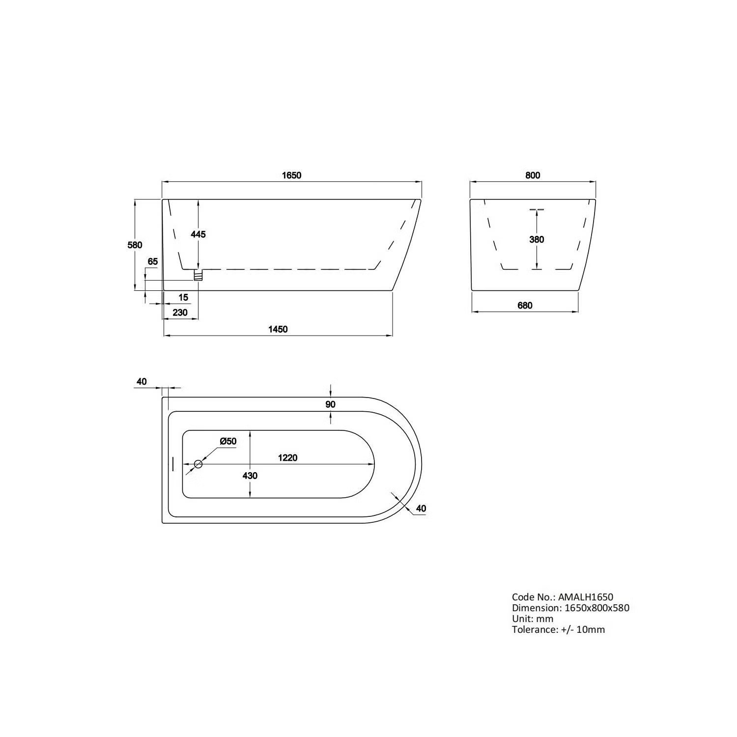 - Bath Dimensions: L1650 x W800 x H580mm