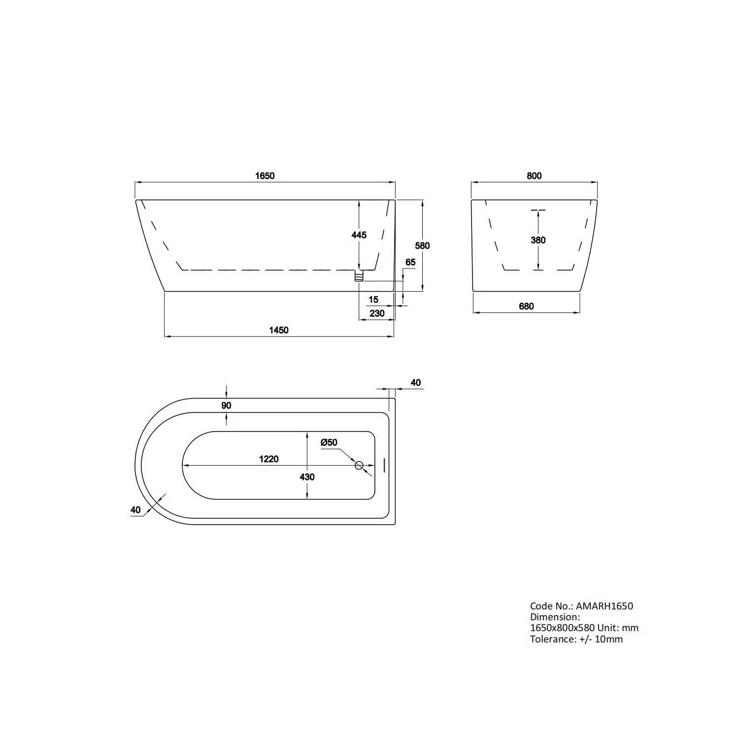 - Bath Dimensions: L1650 x W800 x H580mm