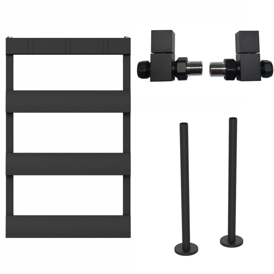 Made from aluminium, this bathroom radiator is built to last. Its thermal conductivity is significantly higher than steel, ensuring rapid and efficient heat distribution that reduces energy consumption. Aluminium is also highly durable, maintaining its performance and appearance over time, and its lightweight nature makes installation quick and easy. This combination of energy efficiency, durability, and ease of installation makes Aluminium the ideal material for modern heating solutions. The matching matt black pipe cover kit is perfect for hiding unsightly pipes between the floor and your radiator valves. The straight manual radiator valves have a square design that brings modern charm to any bathroom.