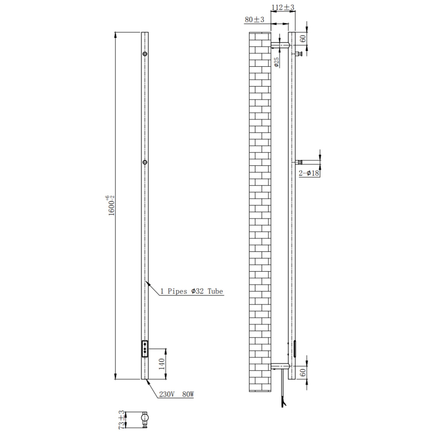 - Radiator Dimensions: H1600 x W73 x D112mm