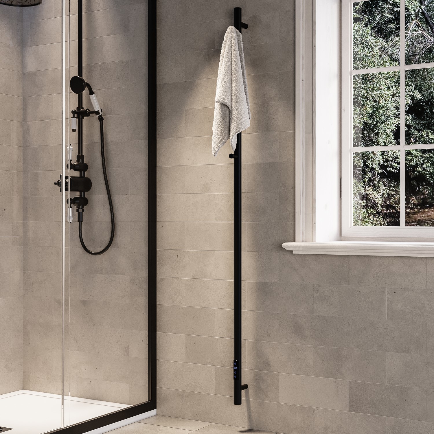 Includes two built-in matching matt black hooks to keep towels warm, dry, and neatly organised.