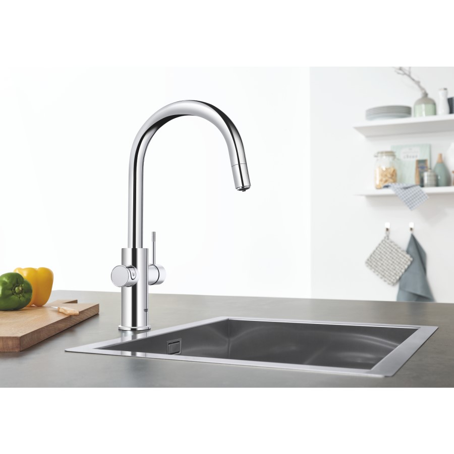 Enjoy the cool and delicious taste of the purest water straight from the kitchen tap with the Grohe Blue Home mixer tap. Simply use the lever handle to get standard water for washing up, or press the LED push button to activate the filter and get chilled or sparkling water. Offering chilled or carbonated still, medium or sparkling water the choice is yours. There’s also a pull-out spray head offering the flexibility to clean all-around your sink thoroughly.