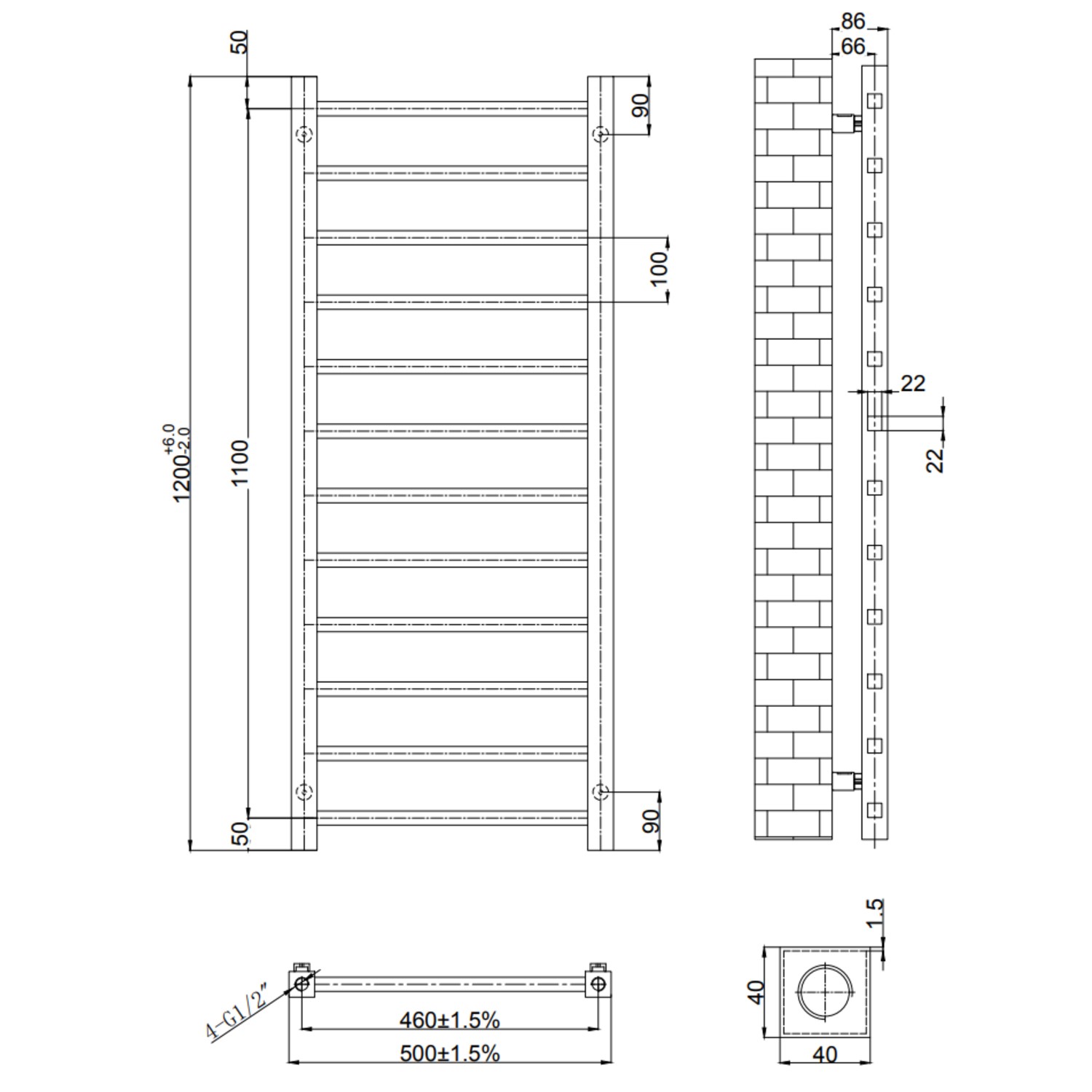 - Radiator Dimensions: H1200 x W500 x D86mm