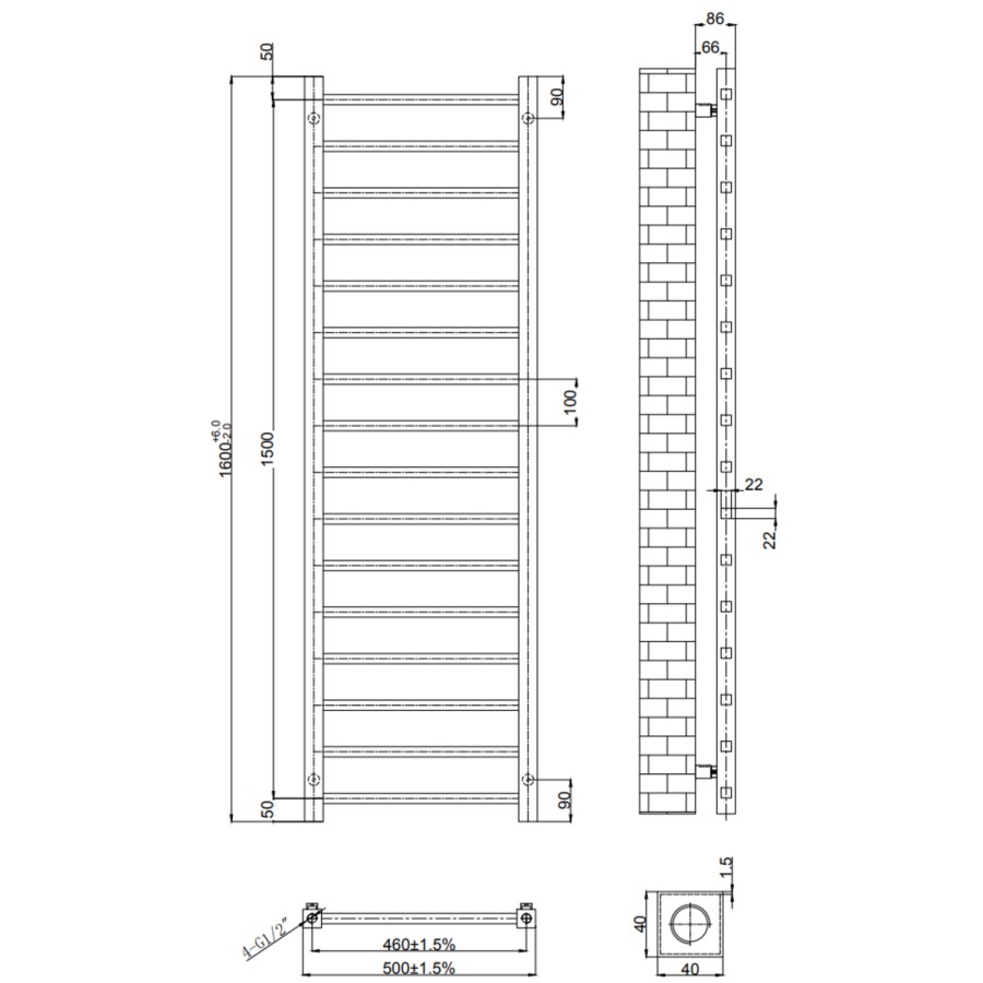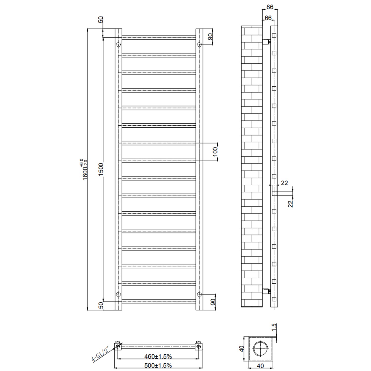 - Radiator Dimensions: H1600 x W500 x D86mm