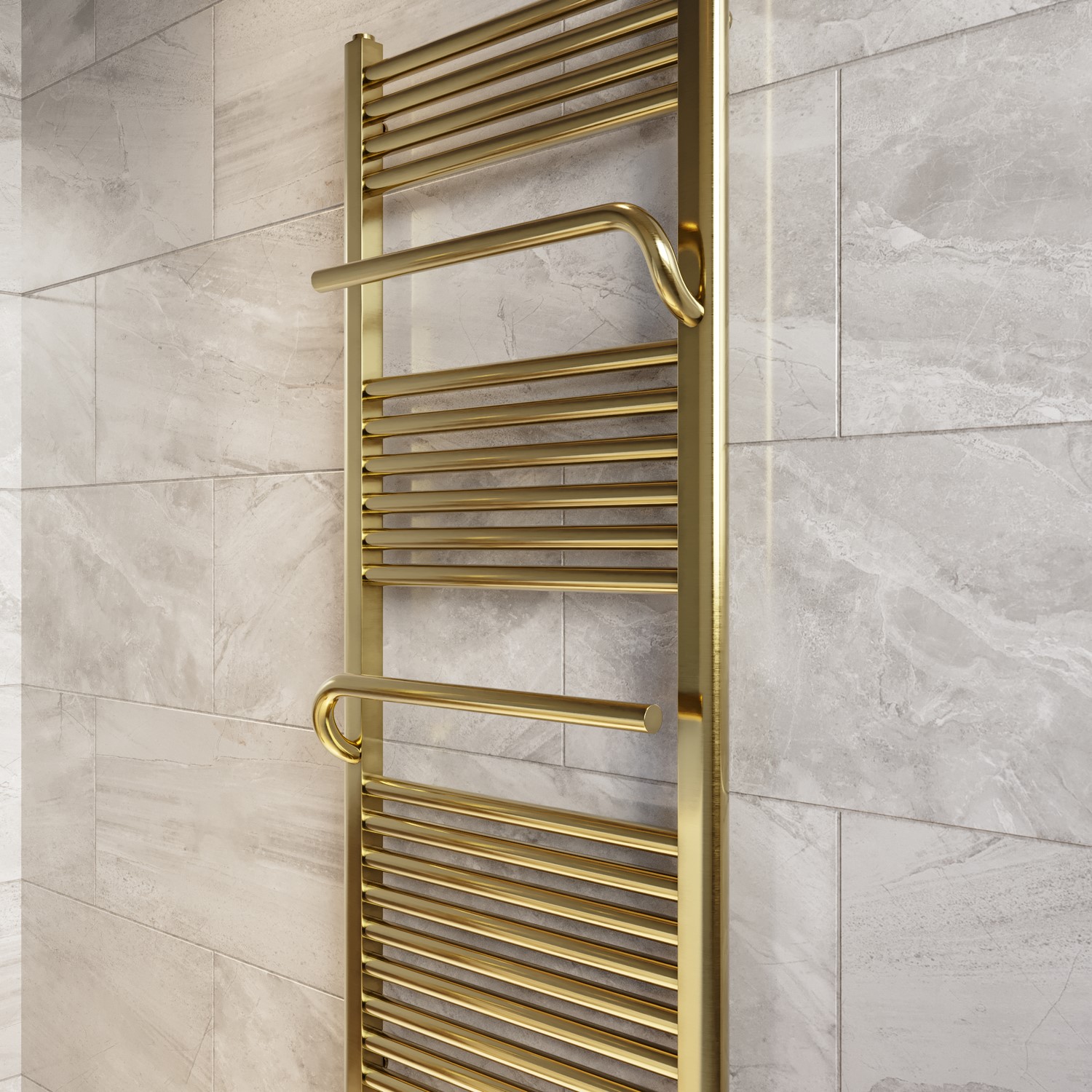 Transform your cloakroom with the brushed brass heated towel rail — a designer central heating radiator that adds both elegance and efficiency to compact spaces. Fuelled by your central heating system, this vertical radiator combines a stylish aesthetic with practical performance. Crafted from durable mild steel with anti-corrosion properties, it’s built to withstand moisture and offer lasting reliability. The towel radiator features 12 rails, plus 2 additional heated towel bars with a depth of 149mm. The bars are designed for hanging and drying two extra towels- perfect for a modern family bathroom.