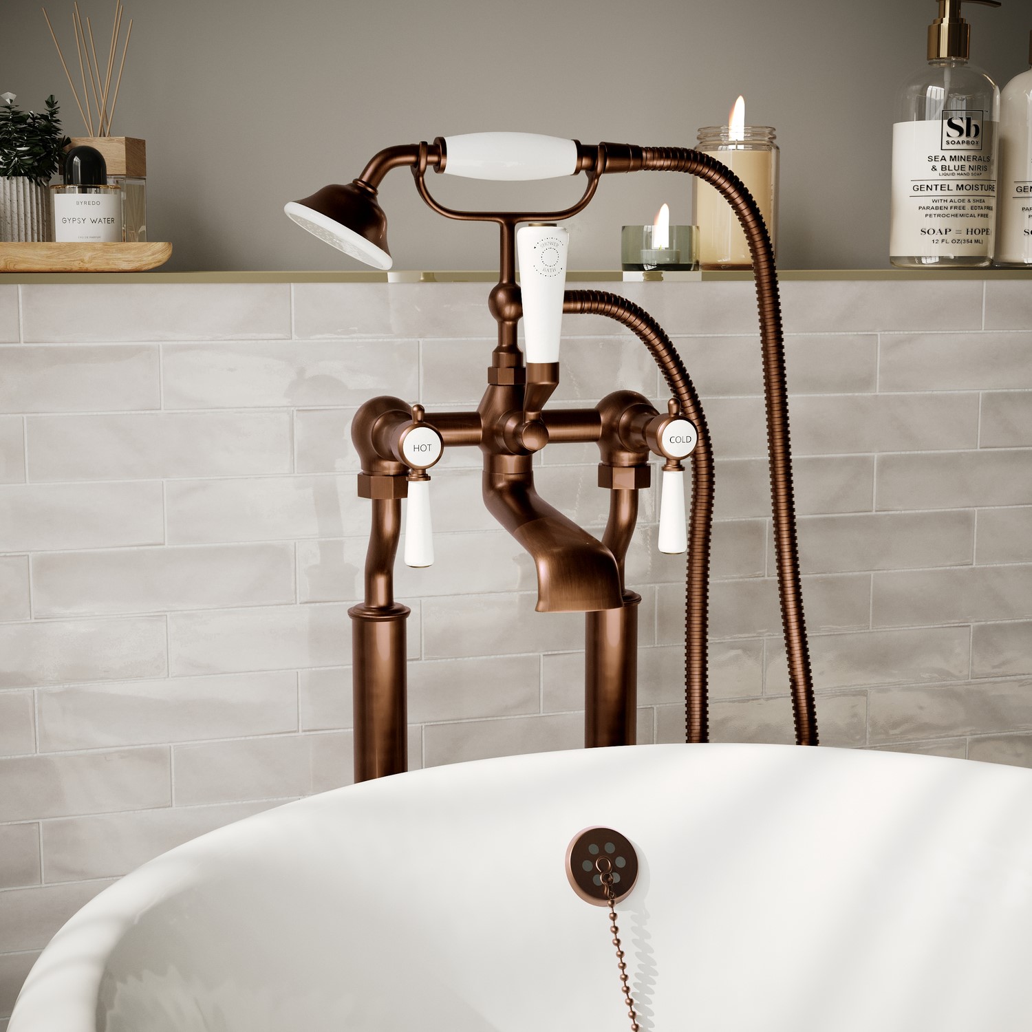 Bring timeless elegance to your bathroom with this Traditional Freestanding Bath Tap and Stand Pipes set. Featuring a vintage-style mixer tap with a handheld shower and matching brushed bronze stand pipes, this ensemble is perfect for classic and period-style bathrooms. The ceramic lever handles and swan neck design enhance the traditional aesthetic, while the durable brass construction ensures lasting quality. Ideal for pairing with a roll-top or slipper bath, this tap setup transforms your bathroom into a luxurious retreat.The handles are ceramic, and the indices (small circles to indicate the temperature) are plastic. This product has a PVD coating which is highly durable, and is resistant to wear and tarnishing. For product cleaning and maintenance follow the user manual guide!