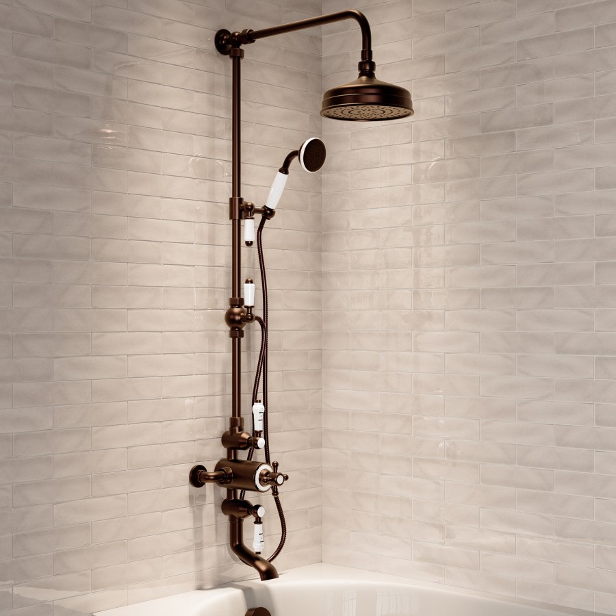 Thermostatic 3 Outlet mixer Shower with Spout: With Traditional round styling and timeless brushed bronze finish.