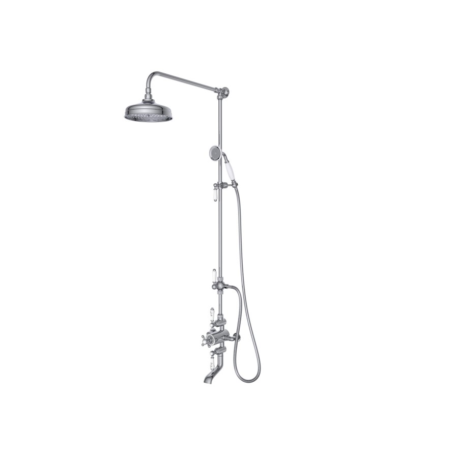 - Thermostatic 2 outlet mixer shower with spout with a traditional round styling and polished chrome finish.