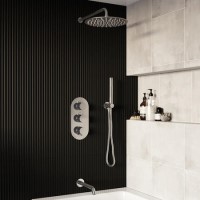 This pack includes overhead shower with 300mm wall mounted head, 3 outlet valve, hose with bracket, and spout bath filler.
