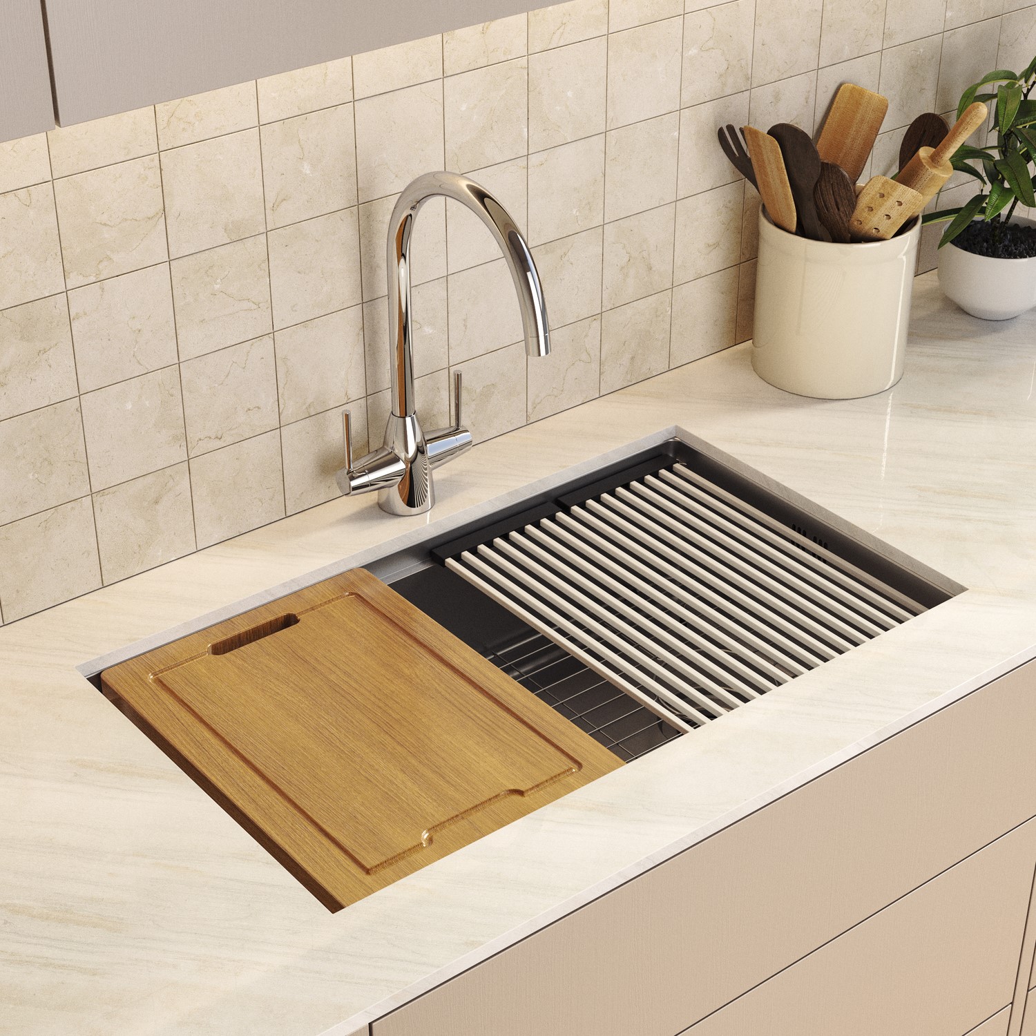 Spacious 762mm Workstation Design: The integrated one-ledge system allows accessories to slide smoothly across the bowl, transforming your sink into a practical prep station while keeping worktops clear and organised.Durable Chrome Nano Linen Finish: A nano-coated stainless steel surface with a subtle linen-textured pattern that helps resist scratches, reduce fingerprints and disguise everyday marks — keeping your sink looking cleaner for longer.